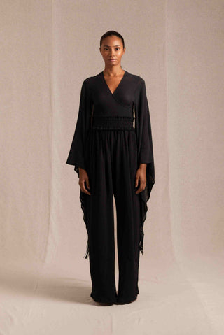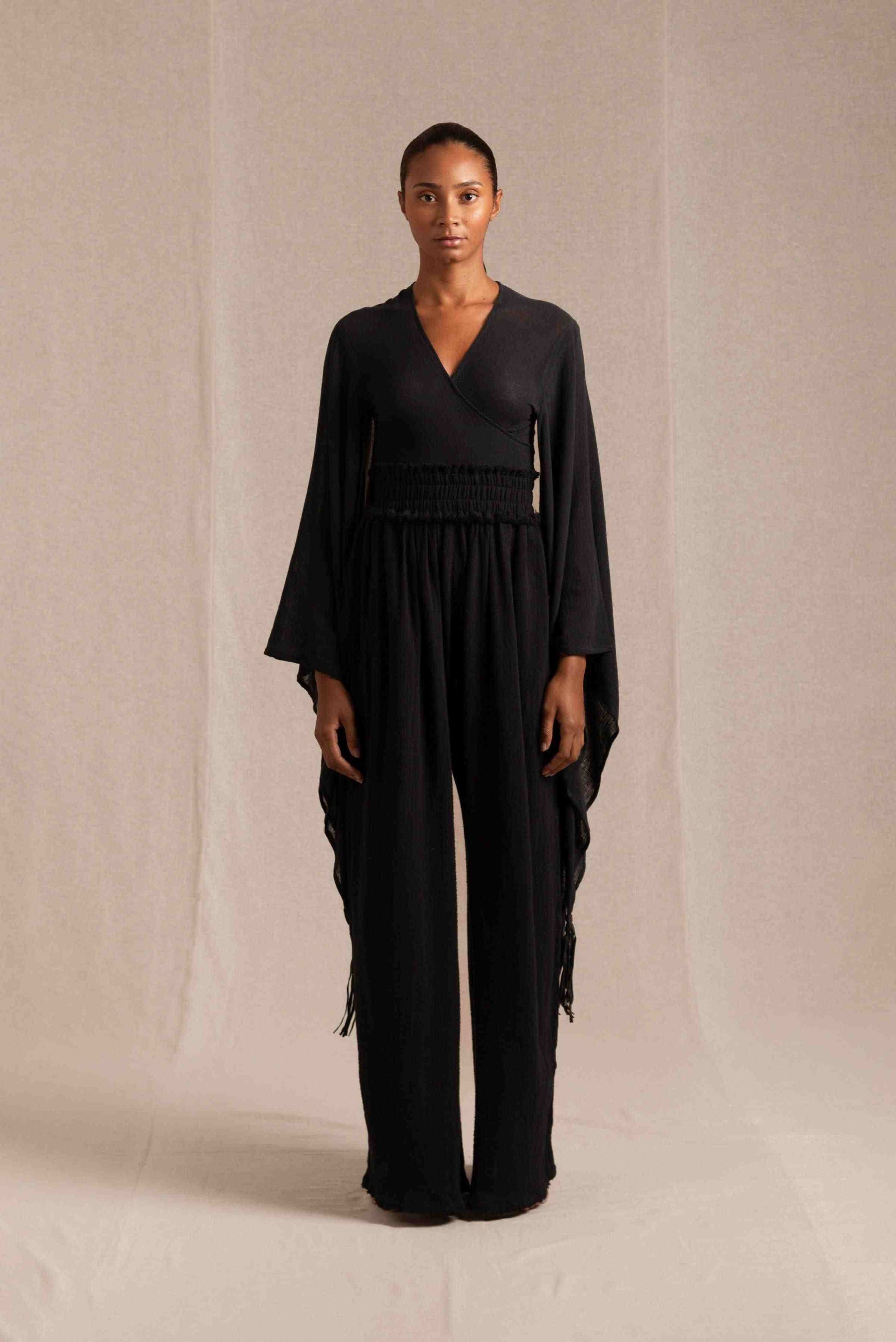 AHUMKAL billows off the wearer, giving her an airy lightness that frees her spirit to explore. Flared sleeves give this top an ethereal feel, with short leather details trailing off the ends.