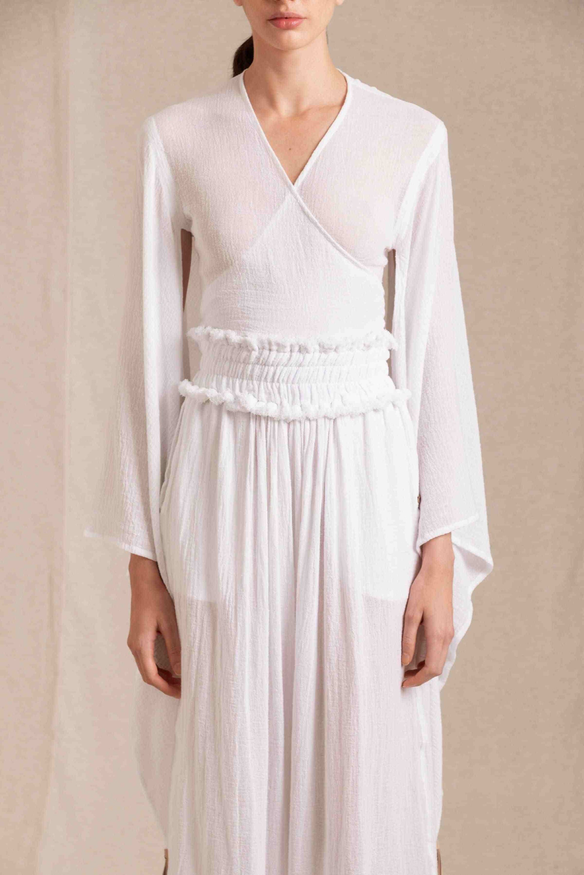 • Lightweight cotton gauze wrap design with a flattering V neckline and flared sleeves for an effortless silhouette