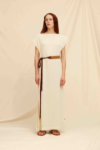 Macramé tie belt | Signature macramé front detailing—crafted with decorative knots to form expressive patterns that embody artisanal storytelling | Encorchado Artesanal waist ties—hand-stitched and twisted fabric cords with knotted ends for an adjustable fit | A sculptural accent that reflects CARAVANA’s spirit of intentional imperfection and tactile craftsmanship