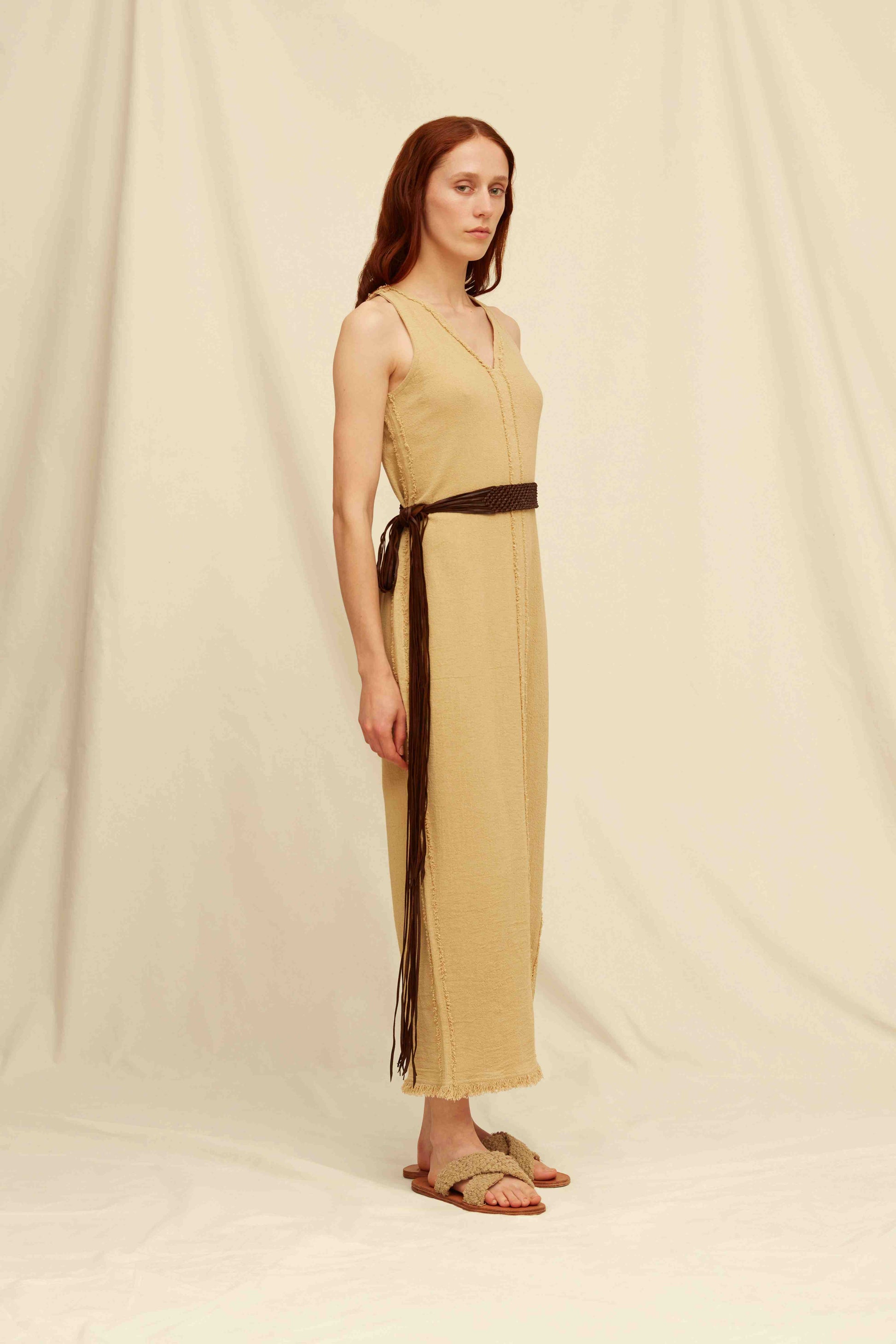 • Cuero Cortado waist ties with hand-knotted ends for an adjustable fit