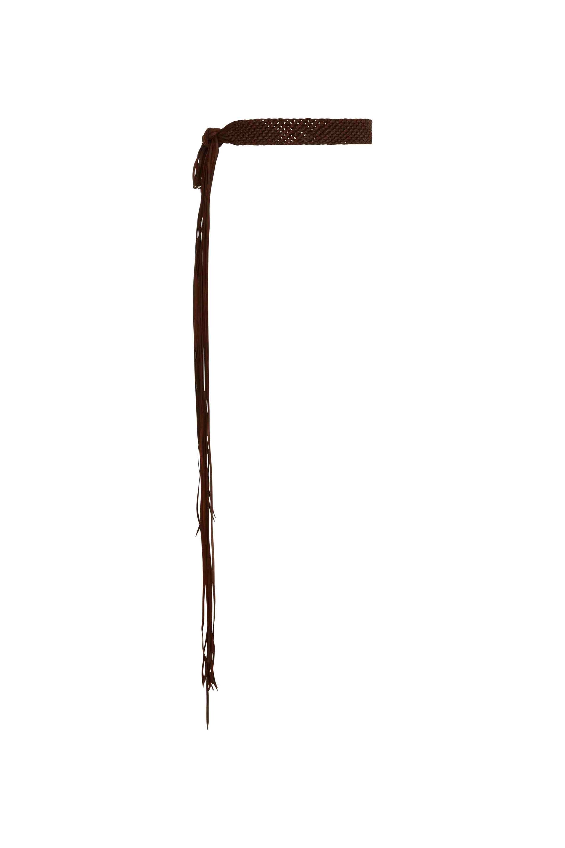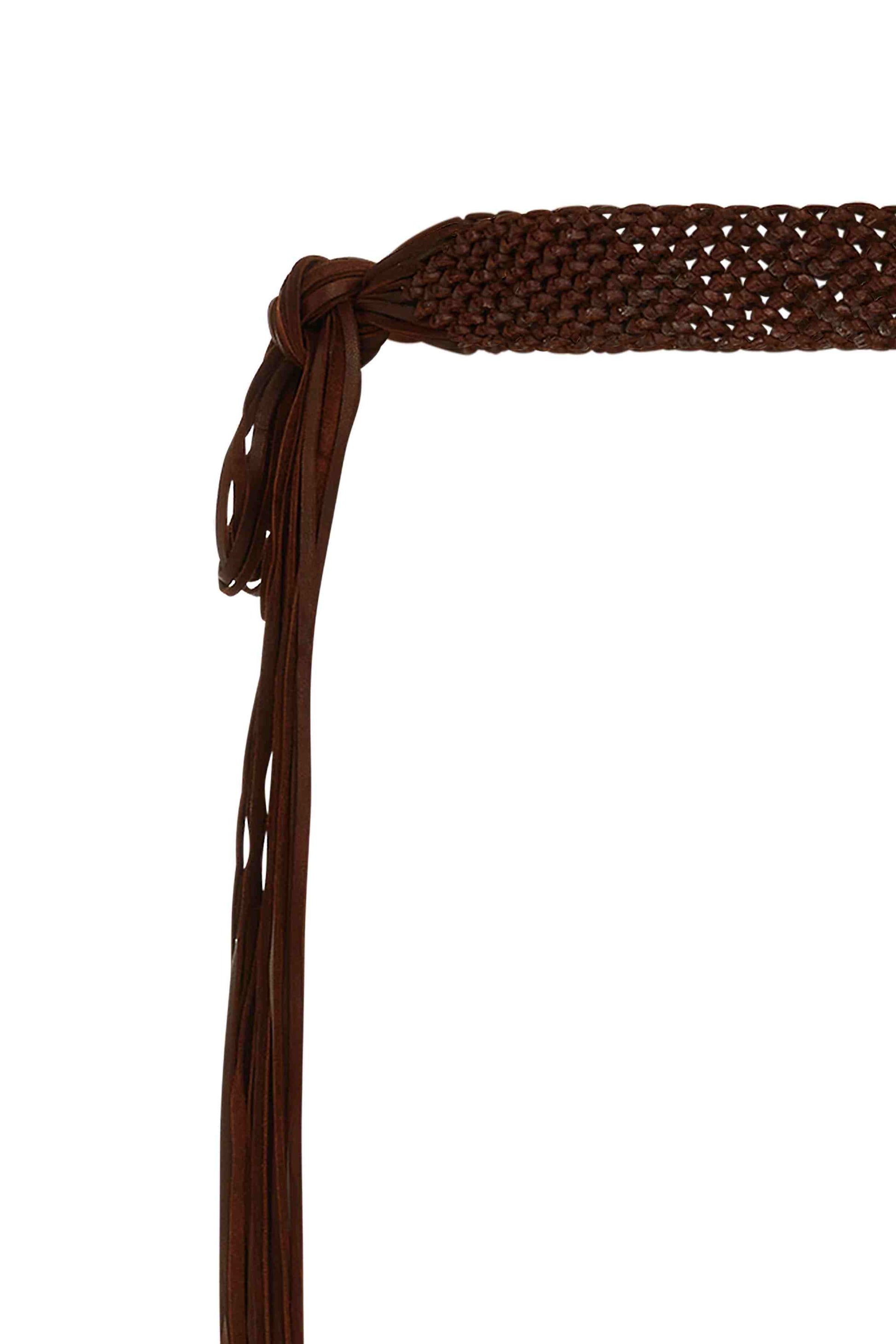 • Macramé leather tie belt with decorative front panel featuring signature knots