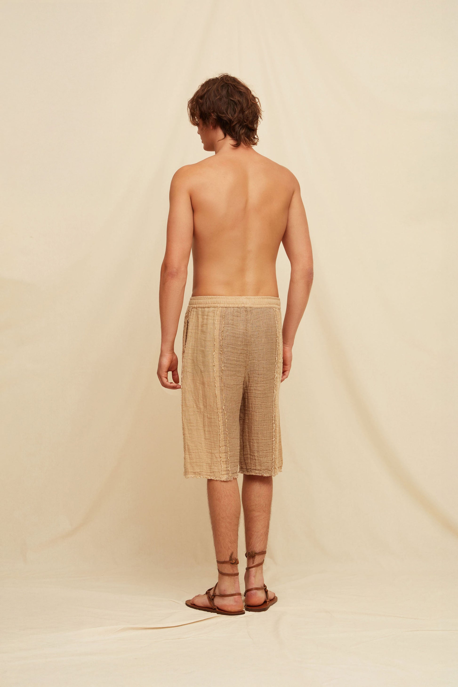 Hand-frayed, unique, and hard to define. These long drawstring shorts carry a textured weight - loose enough to lounge in, but sharp enough to wear out. There's an offbeat elegance to them, with a sense of something timeworn. Like you've had them forever, or borrowed them from someone unforgettable.