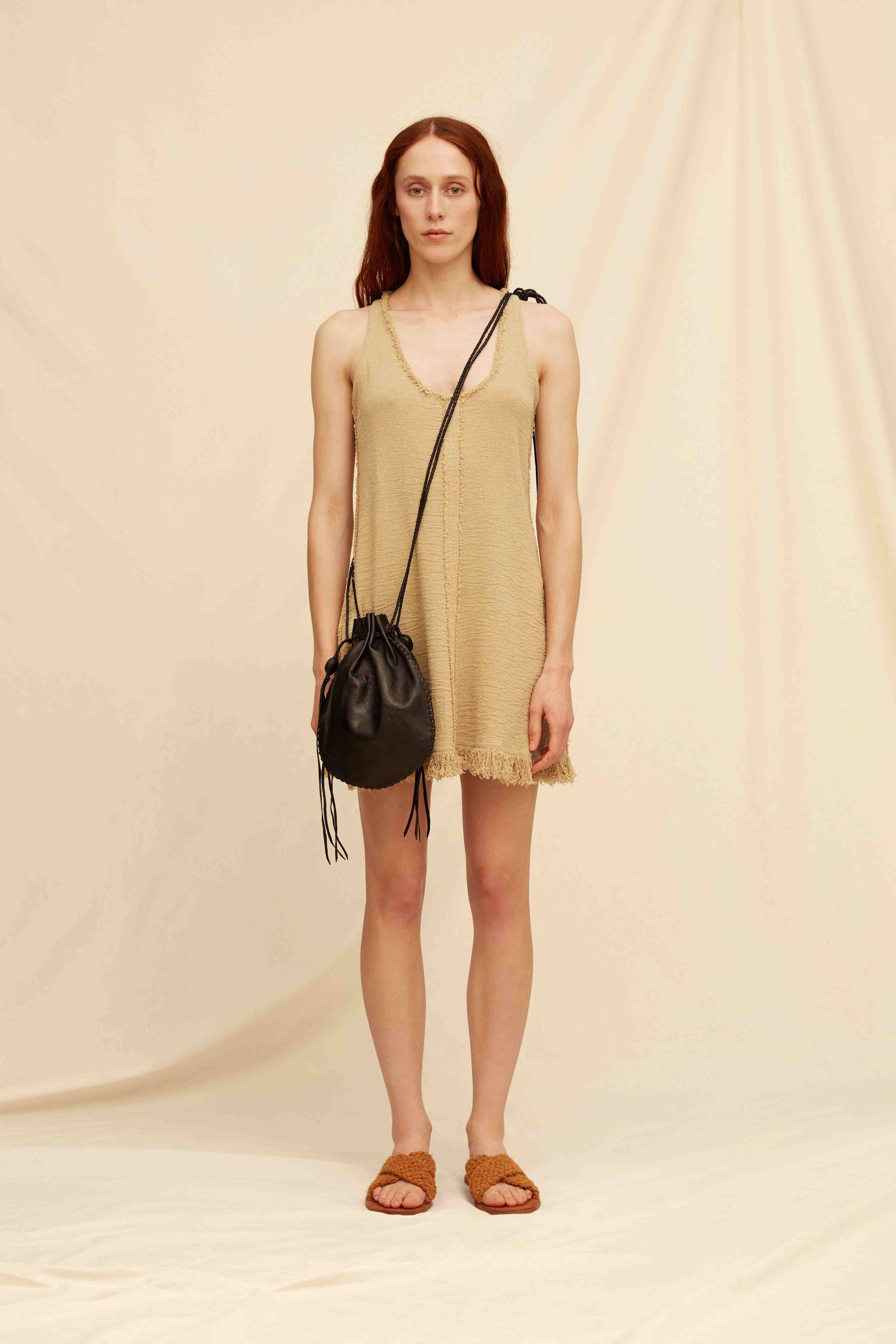The Bolin bag is both sculptural and grounded, echoing a primitive silhouette inspired by desert landscapes and nomadic utility. Crafted in black leather with distinctive hand-stitched seams, it nods to ancient forms, evoking the shape of a water carrier slung across sun-warmed shoulders. Its drawstring closure invites intuitive styling: fasten it at the waist, sling it across the body, or let it hang loose. Unpolished, elemental, and made to move with you.