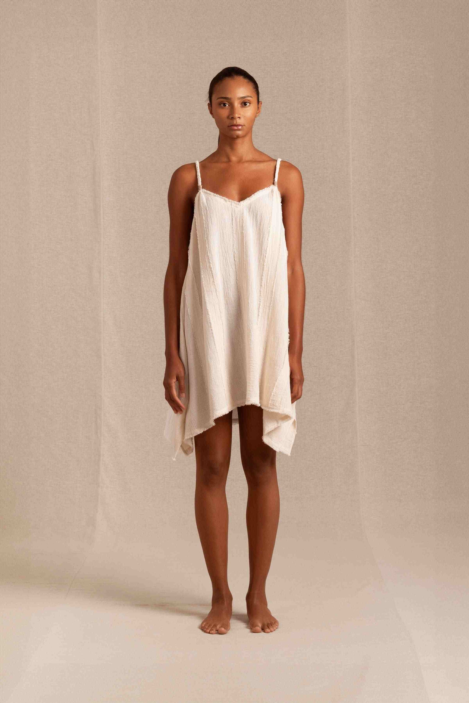 Relaxed is your mood while in CHI, an elegant mini-dress woven from artisanal cotton. With our signature frayed details throughout its design, play with your creativity and pair this piece with our capes, vests, and accessories to elevate your style while in the sunshine.
