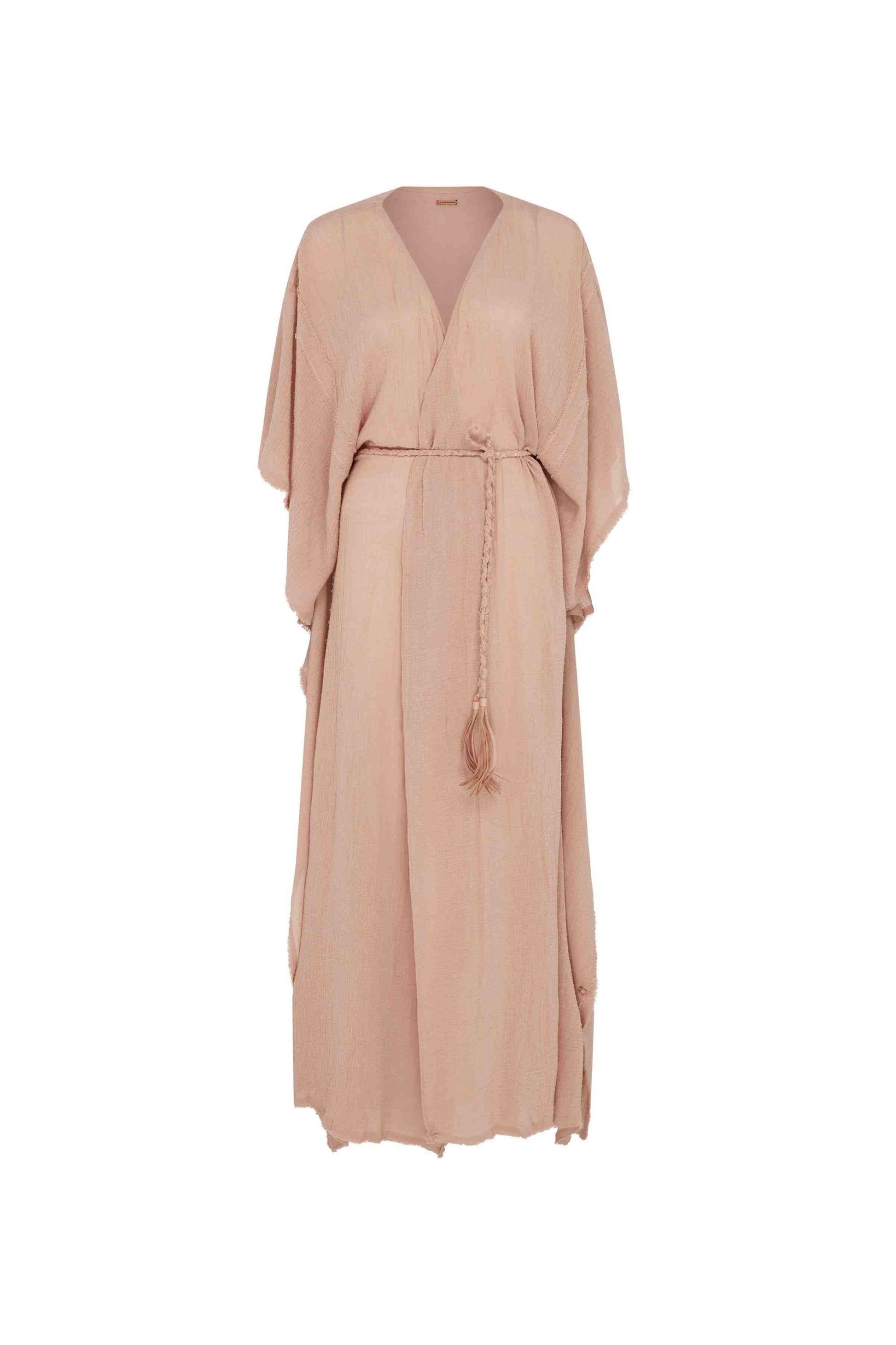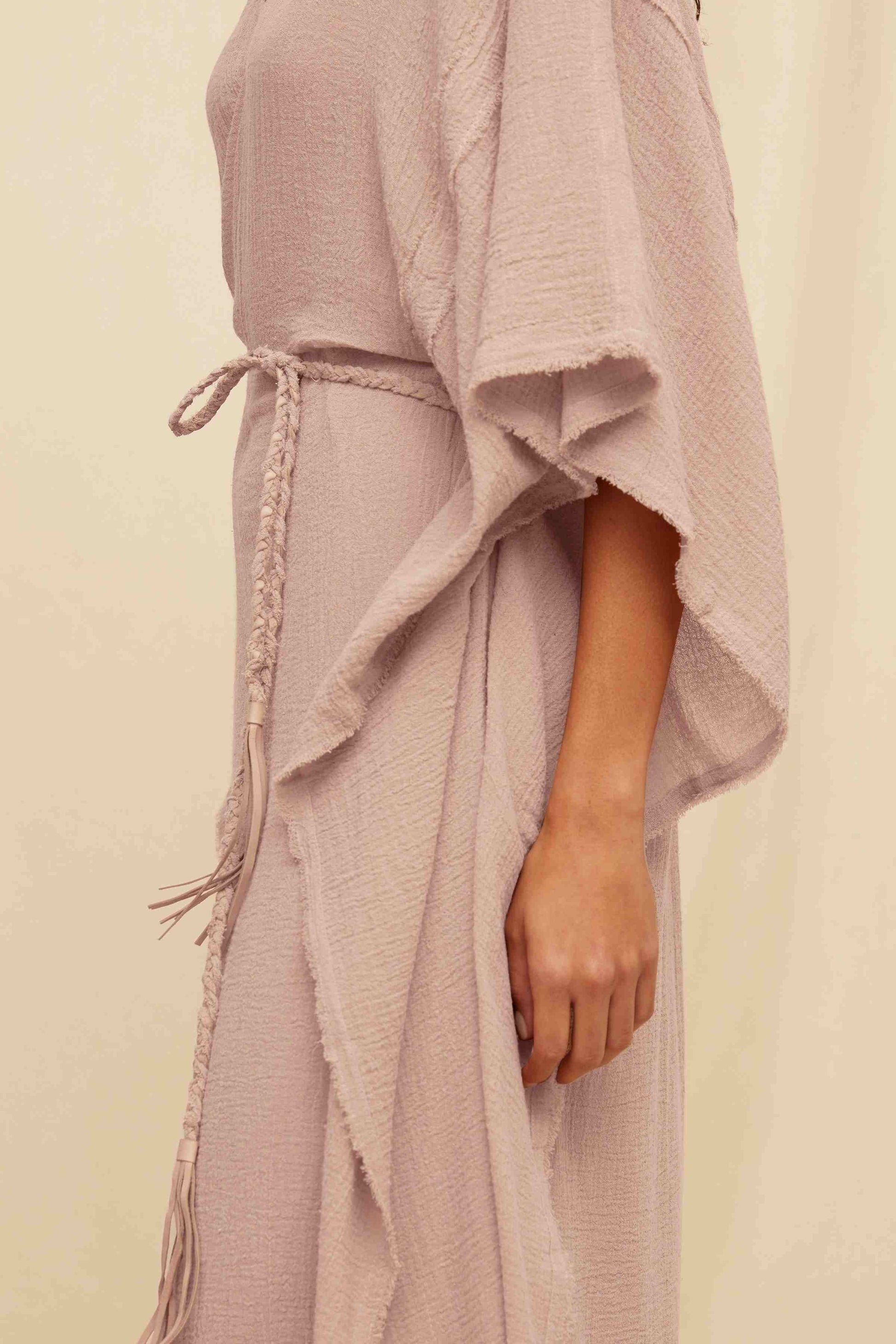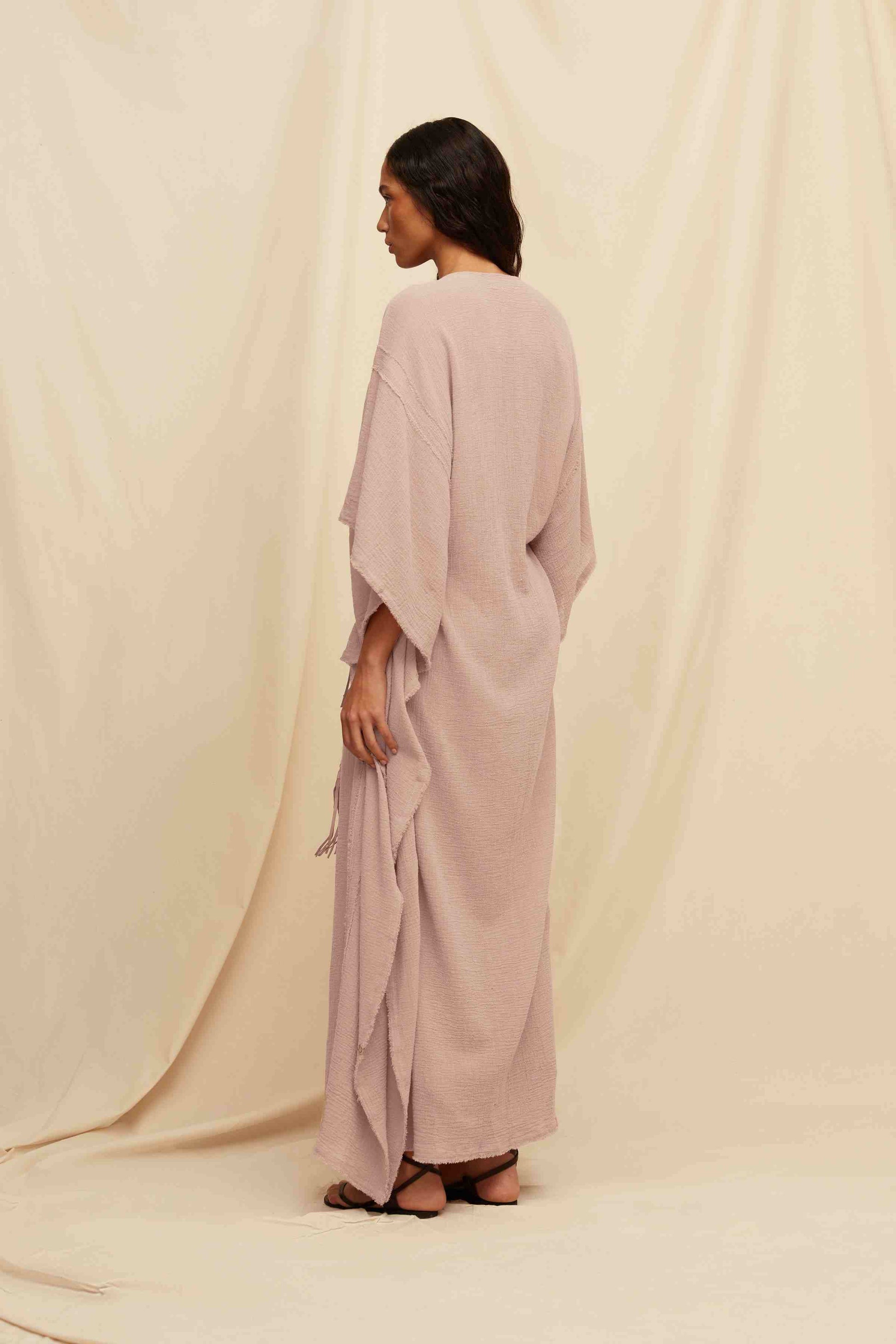 A whisper-soft kaftan in a muted, mineral tone, reminiscent of earth, the CHUMUK drapes effortlessly in cotton gauze. The mini frayed edges bring a tactile finish, while its flowing silhouette embodies carefree elegance.