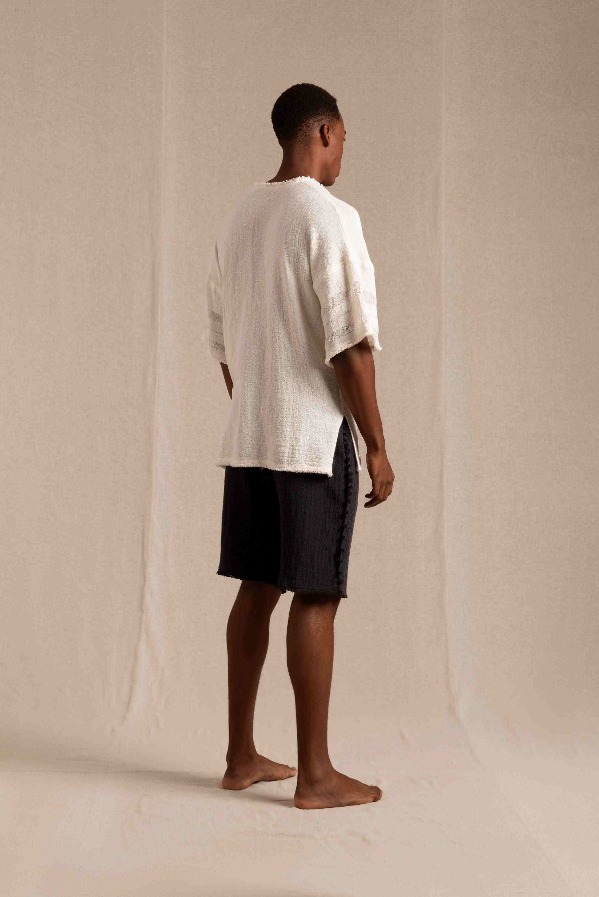 • Short sleeves with frayed details adding subtle texture and artisanal character