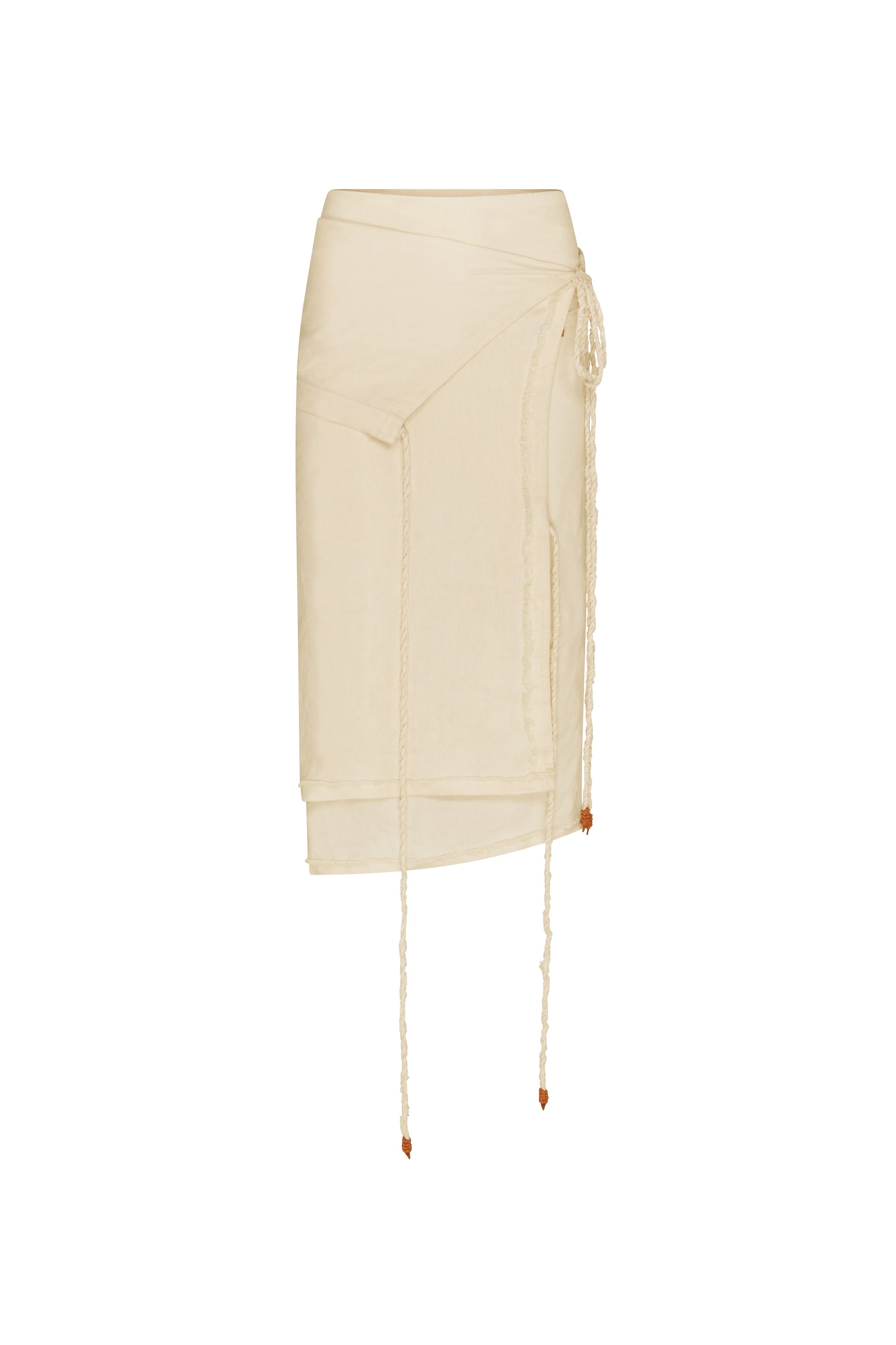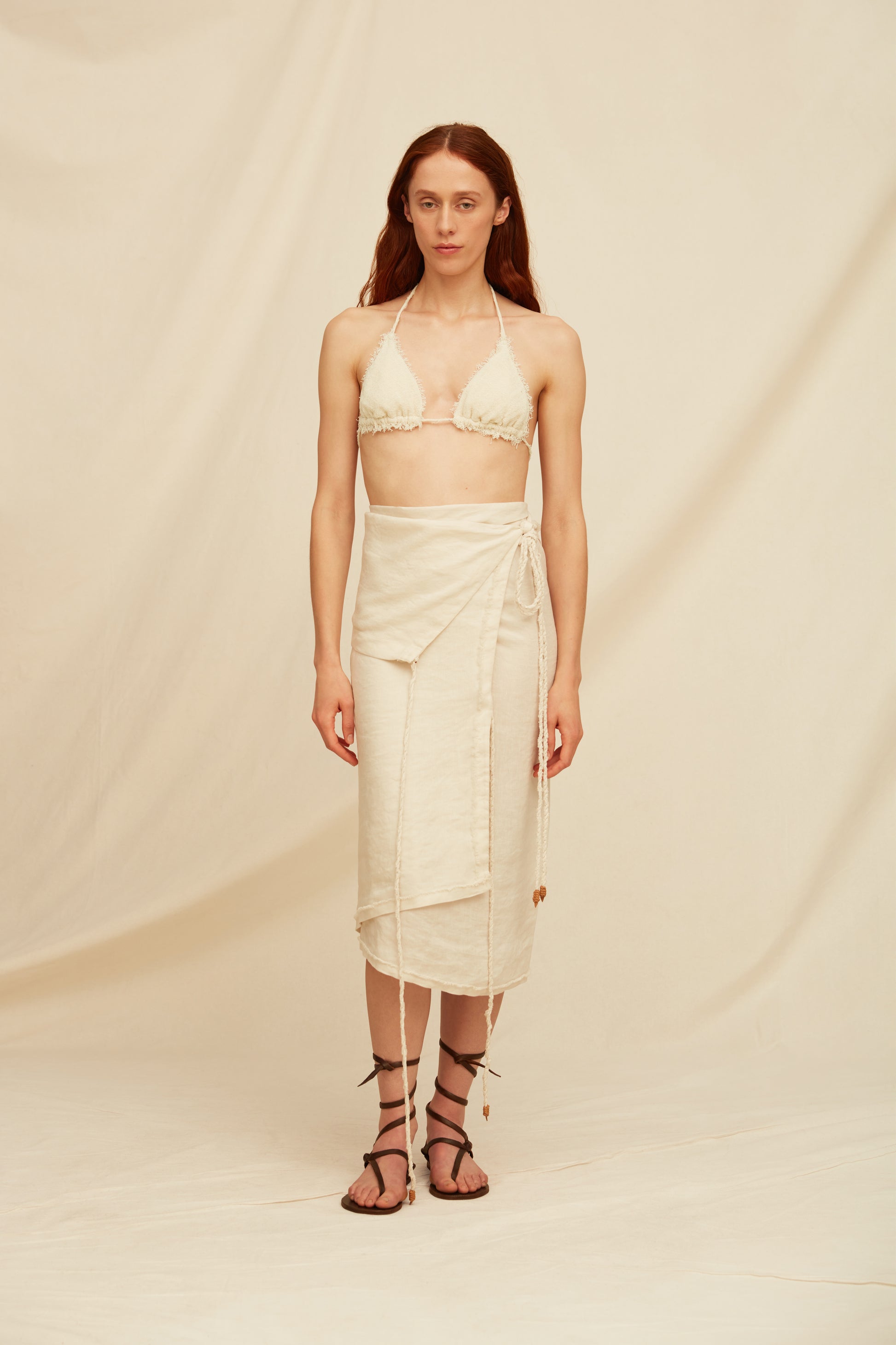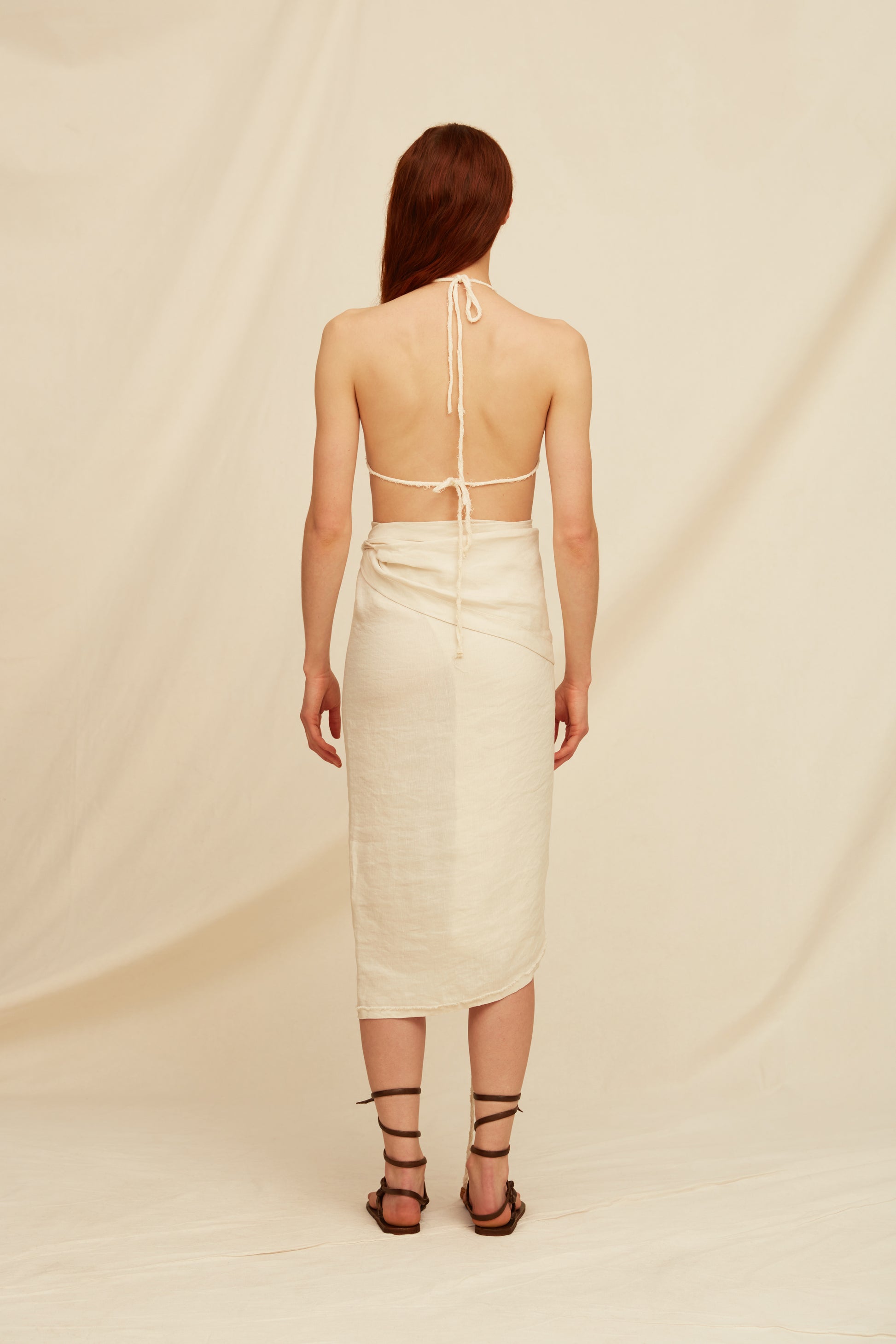 Long, fluid and faintly ceremonial. The Evinchui ties in multiple places and wears in multiple ways - a layered skirt with quiet purpose. In soft bone white with signature hand-woven leather ties, it's peaceful and poised. For walking barefoot. For days that don't follow routine.