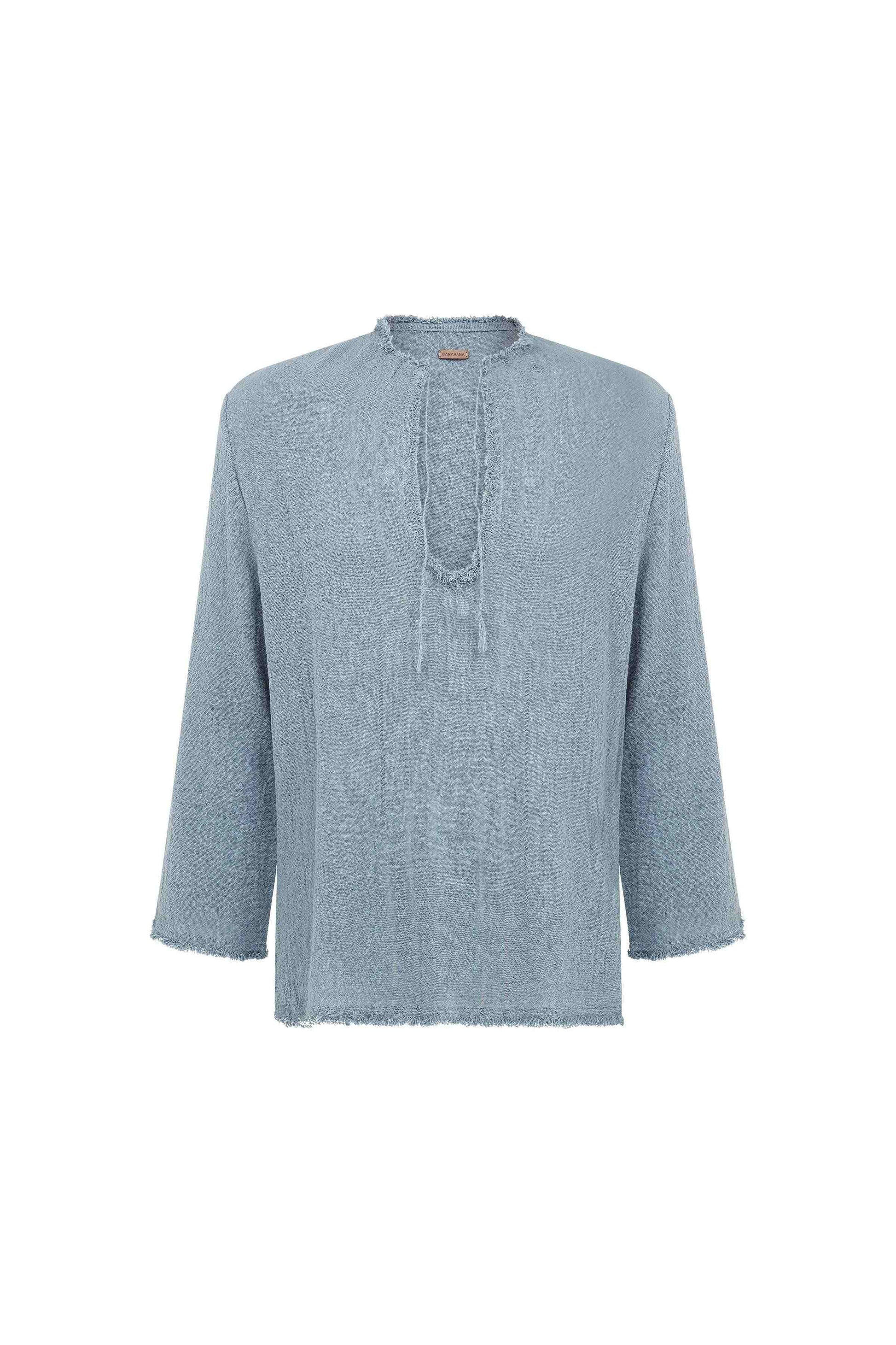 The HUBIKU shirt, fashioned from cotton jute, envelops you in a stylish embrace. Subtle frayed edge detailing adorns the sleeves, neckline, and edges, adding a touch of contemporary flair.