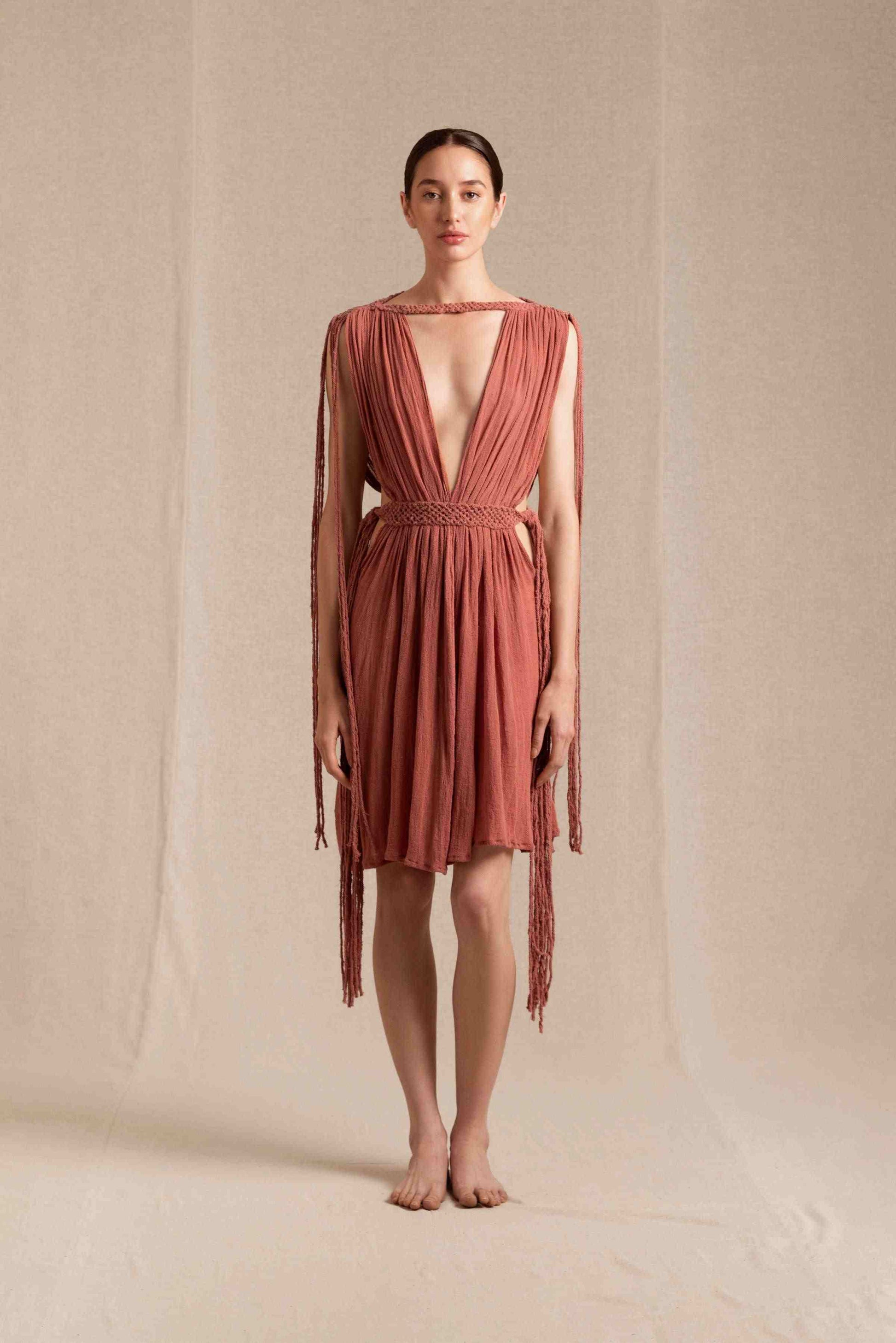 Celebrate your allure in the JOCHOL dress, a garment that brings out playfulness and sensuality from within you. This piece is elevated by intricate macramé details adorning the waist, shoulders, and long tassels, adding flair to every step.
