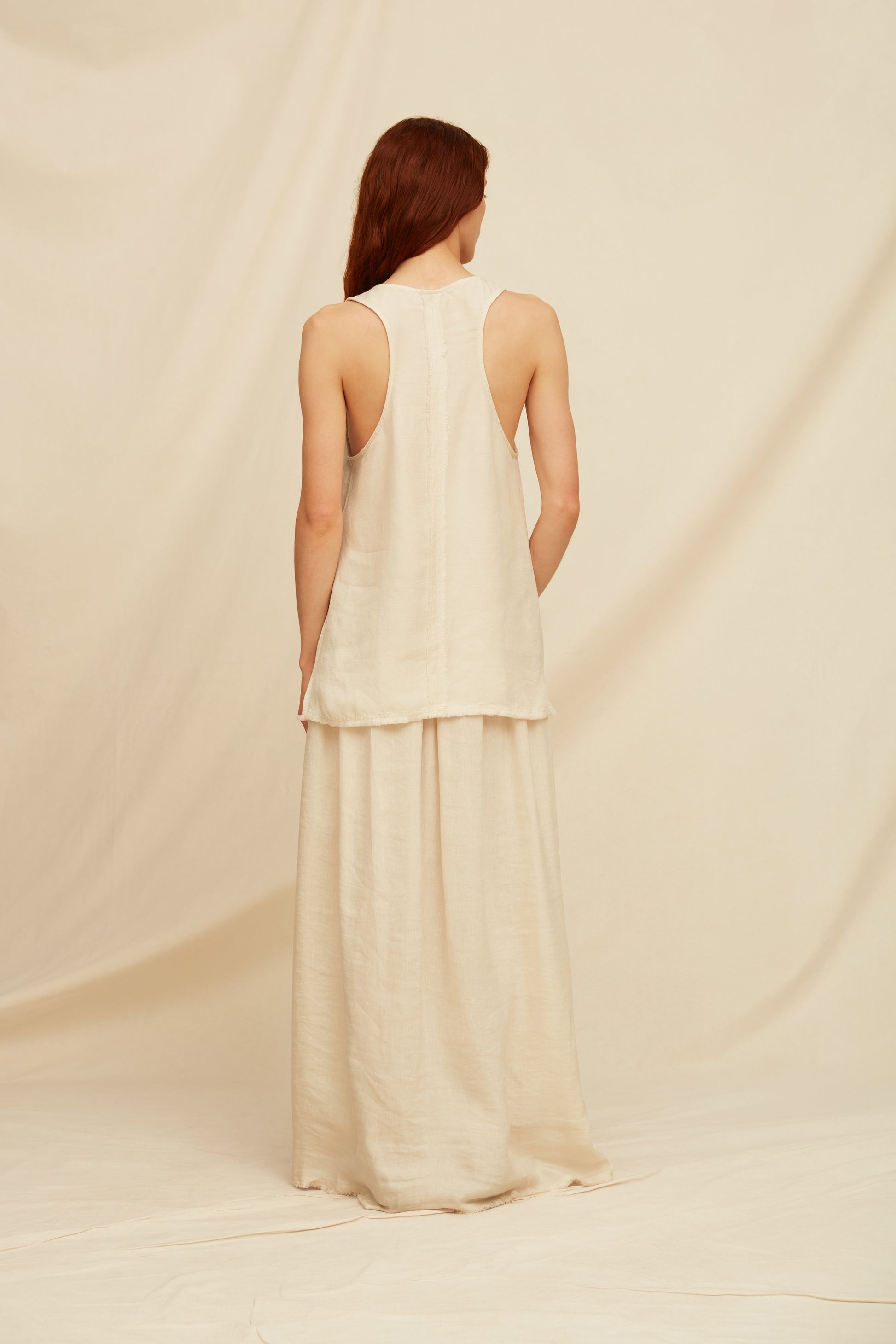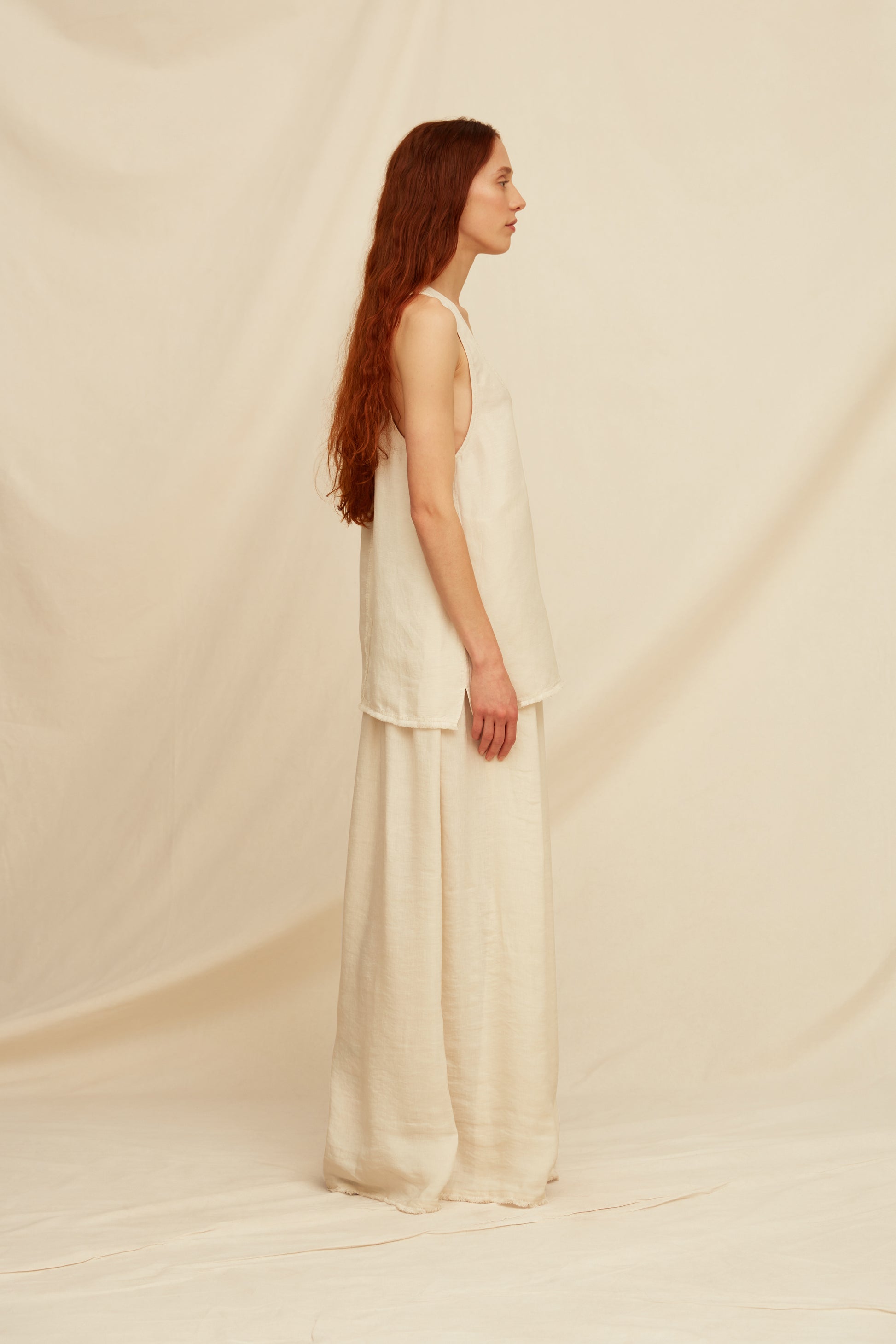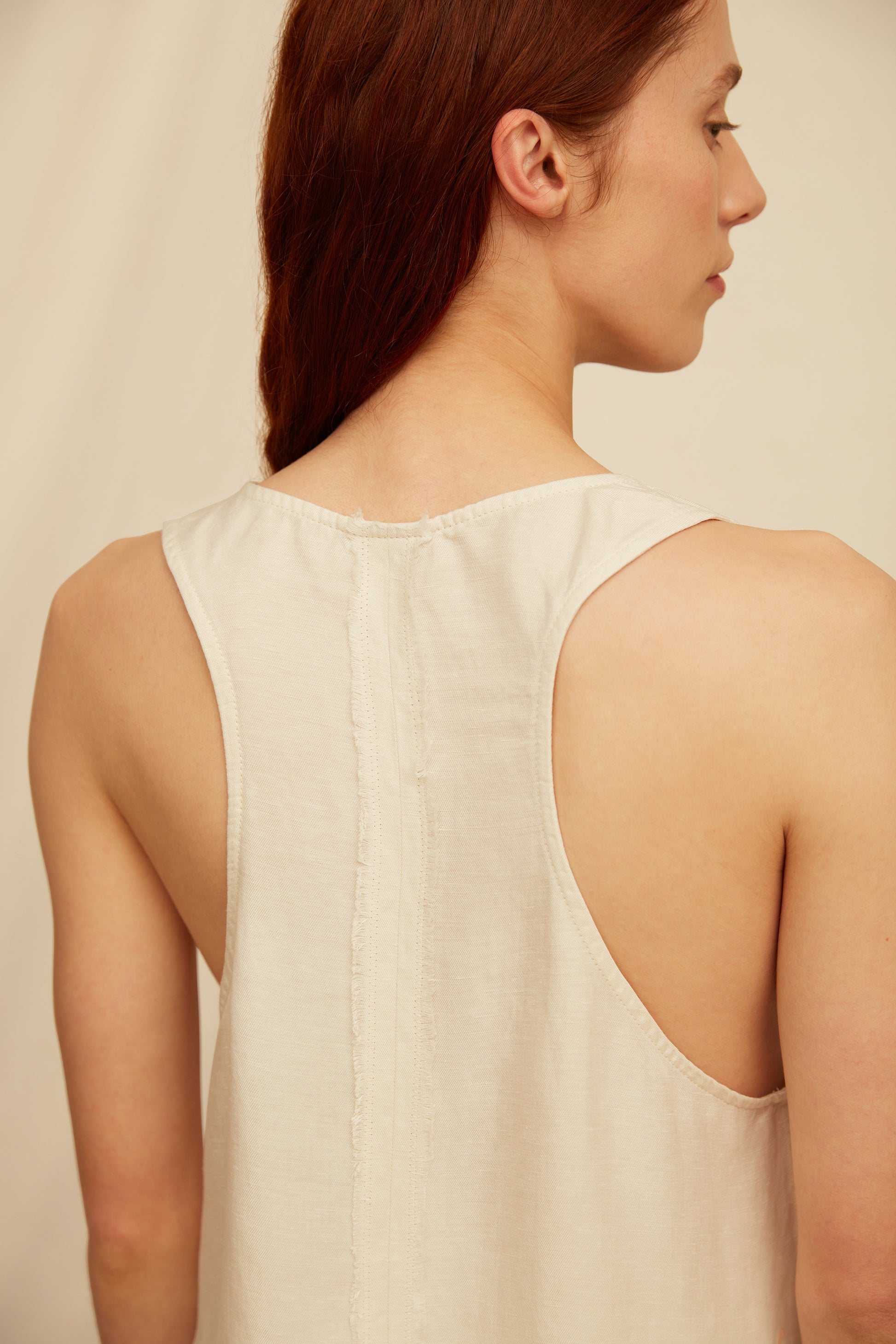 A simple shape with subtle posture. Clean neckline, stitched spine, and raw fringe that skims the body. In chalky bone, it acts as neutral punctuation - grounding whatever else you throw at it. Sometimes that's all you need: one line drawn with intention.