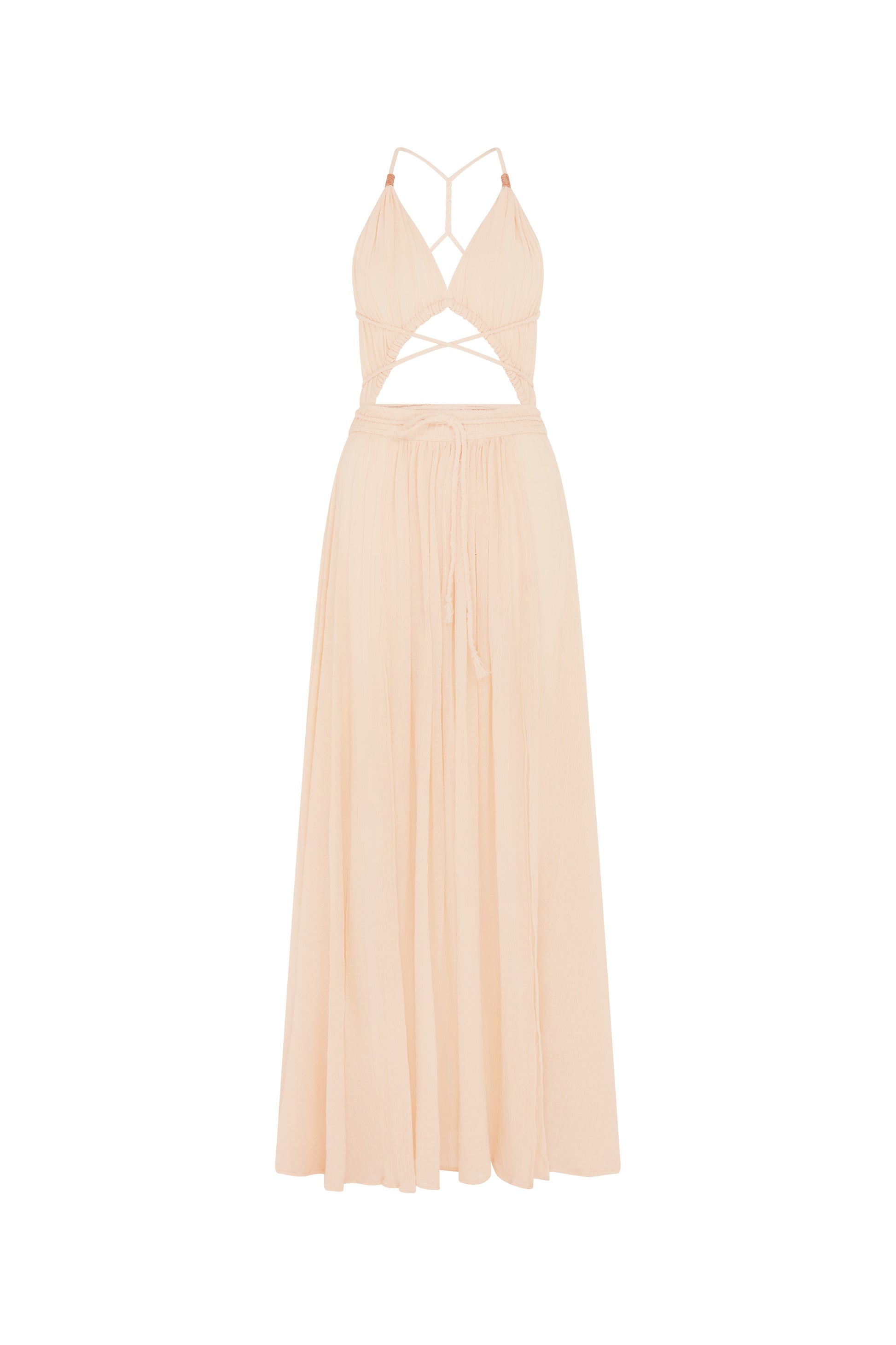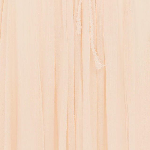 Modest, but never quiet. The Kimi dress opens to a soft triangular reveal at the navel, framed by ties you knot your own way. In raw cotton gauze and light pink tones, it holds the tension between softness and strength, elegance and edge.