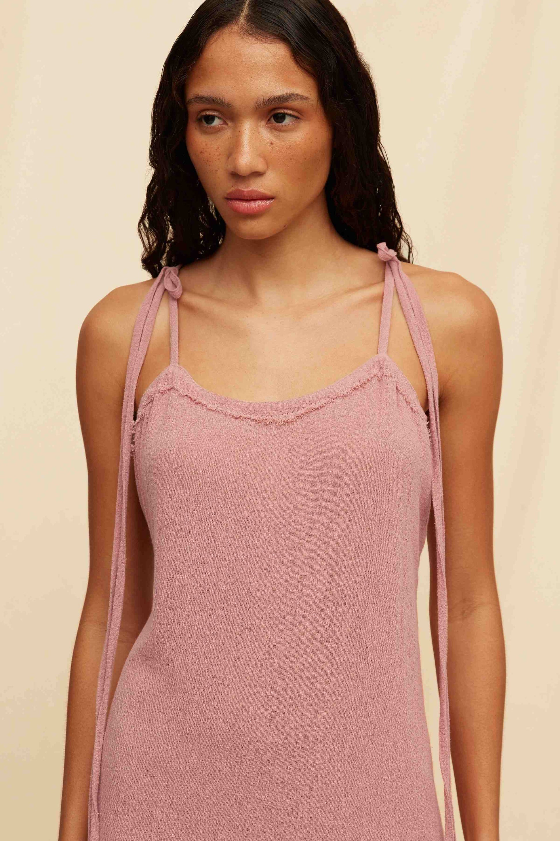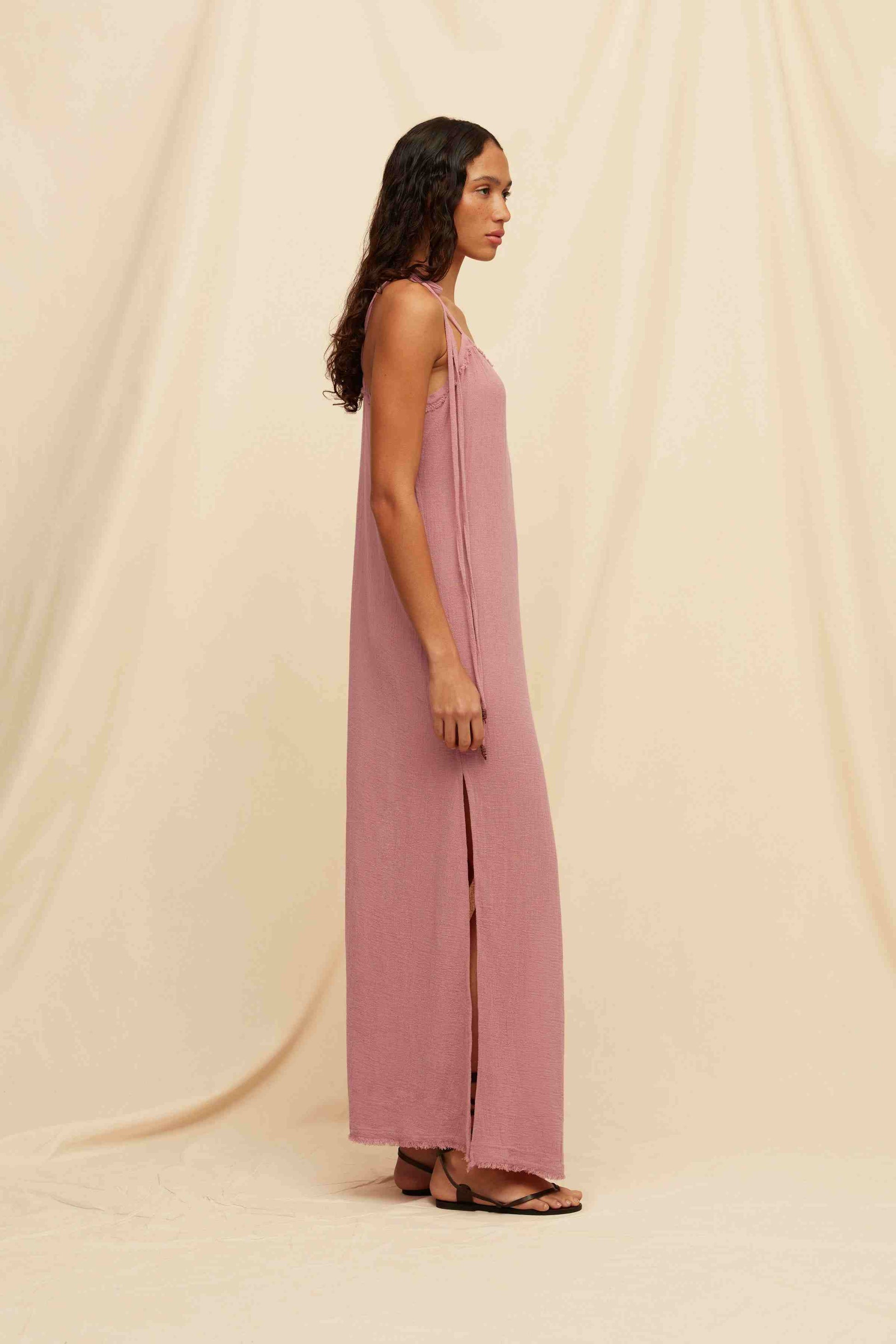 Soft yet striking, the KONIK dress, a celebration of muted warmth, its desert rose hue enhancing the natural and lighthearted drape of the cotton gauze fabric. A refined silhouette with an air of playful femininity.