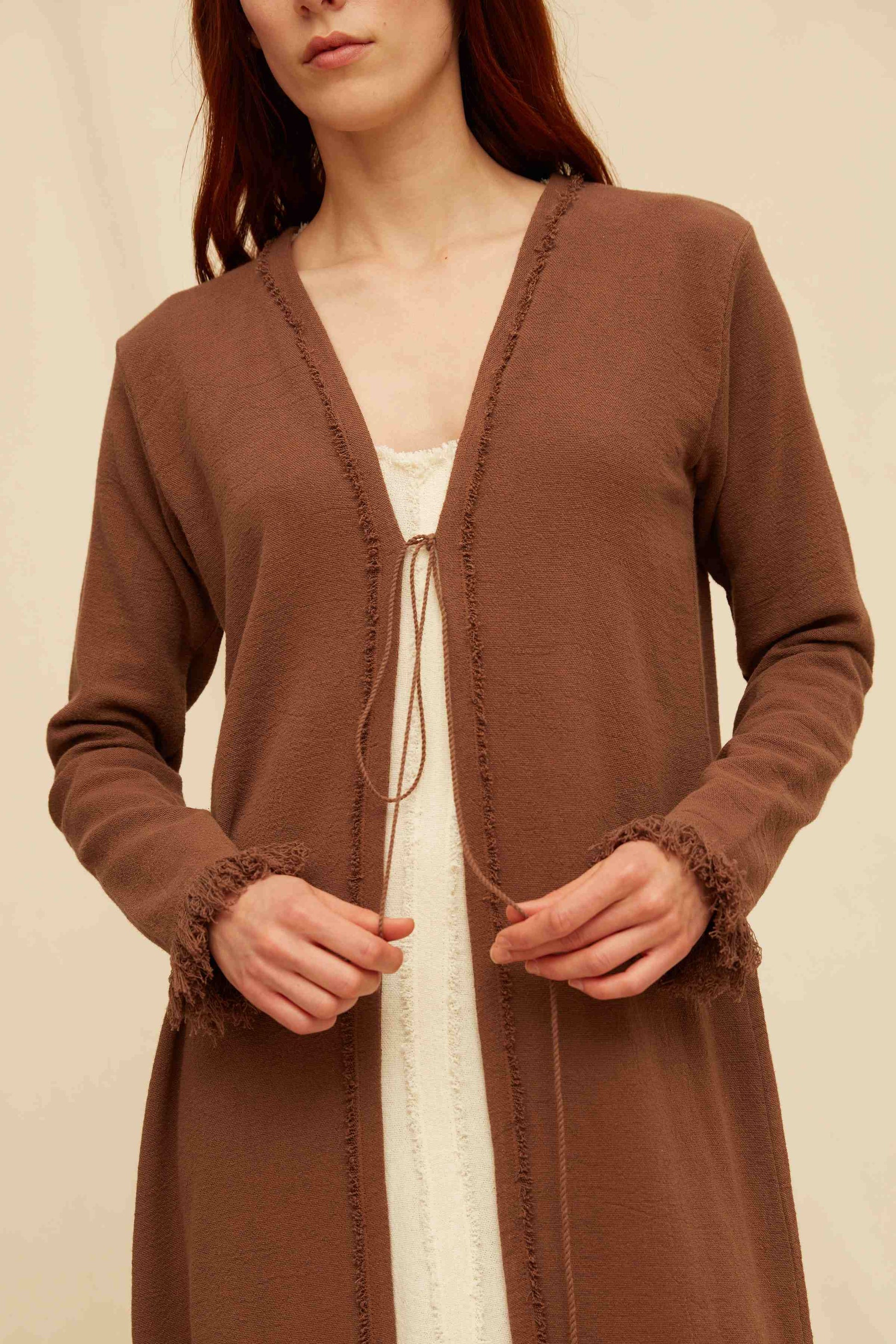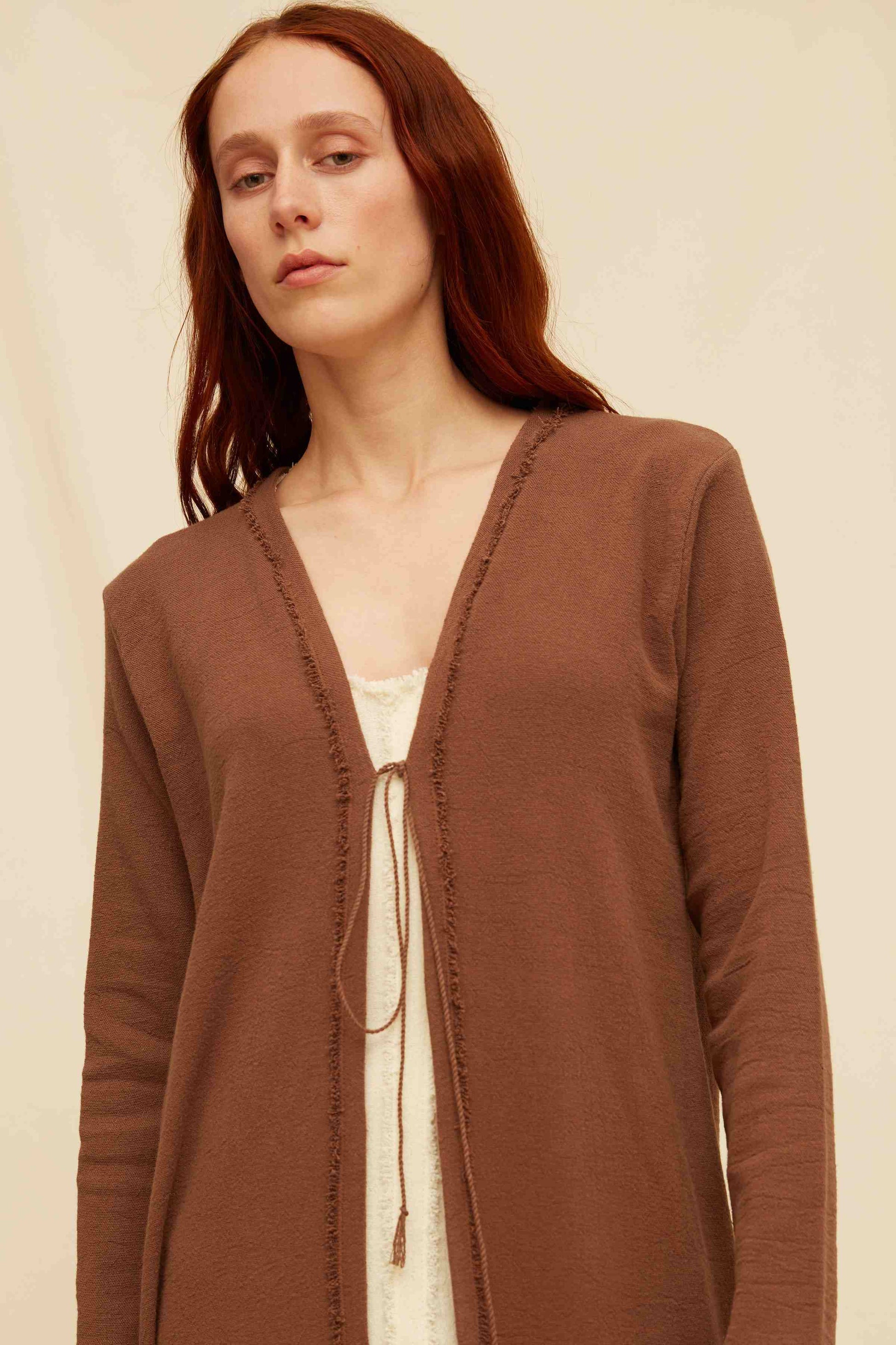 Longline midi cardigan | Long sleeves | Relaxed loose fit | V-neck with open front skirt | Signature Encorchado — self-yarn threads twisted by hand and knotted at the bust | Signature Costura Abierta — exposed external seam with mini hand-frayed edges along the spine | Signature Orilla Expuesta Desflecada — exposed hem with mini hand-frayed edge at neckline and front opening | Signature Desflecado — long frayed detailing at sleeve and skirt hems, created by meticulously removing individual threads by hand