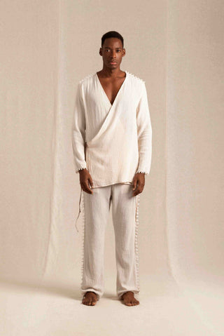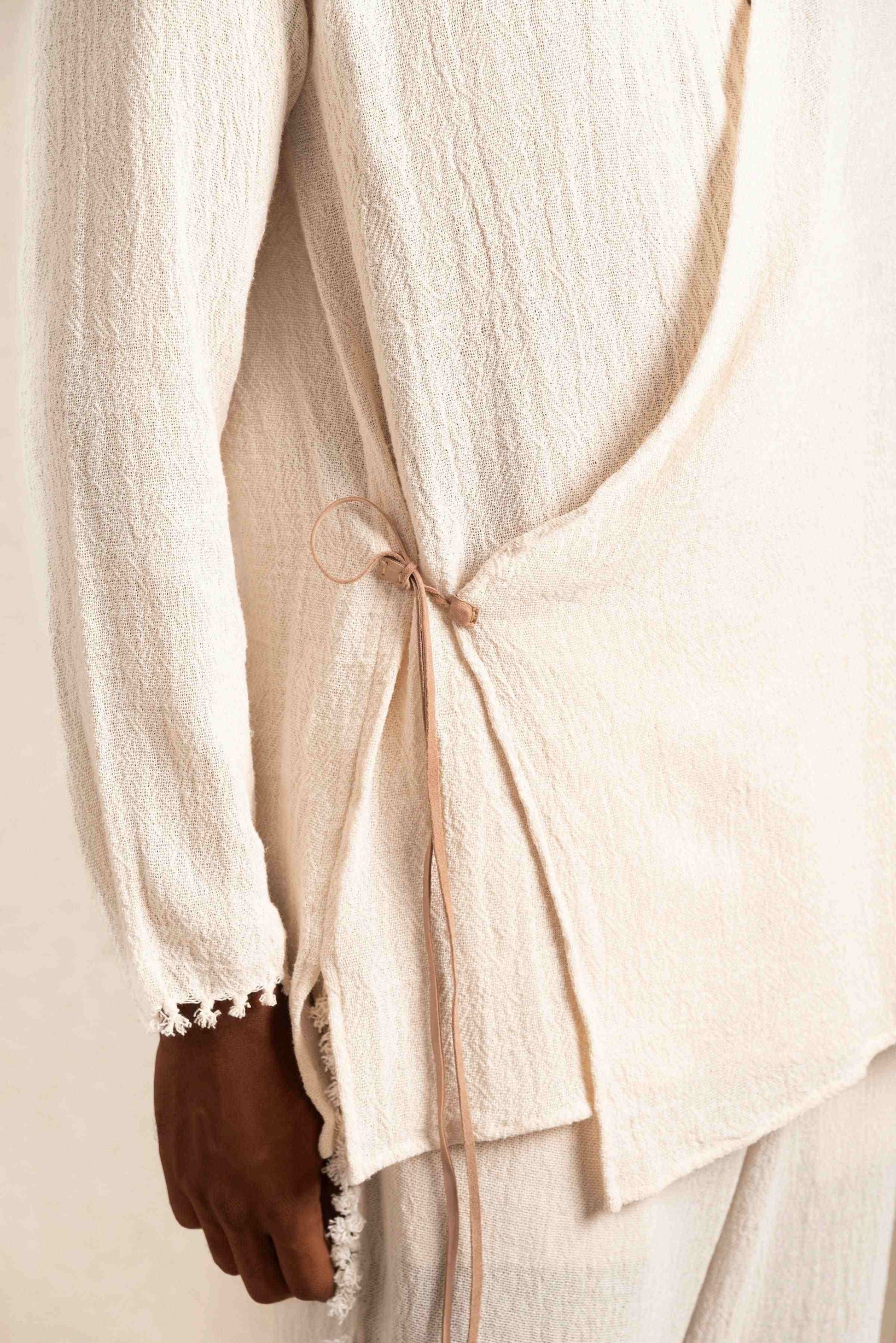 • Cotton jute wrap shirt with long sleeves and adjustable leather tie closure