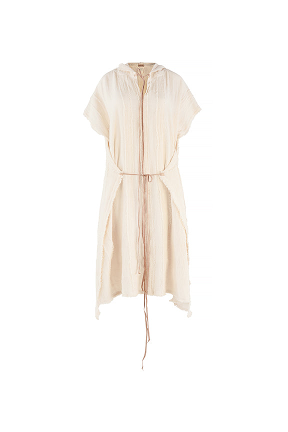Embrace the distinctiveness of NTUCHI, a long, hooded, v-neck poncho made from cotton jute. It features leather ties at the neck and waist, providing customizable adjustments. The billowing silhouette of this unique piece is adorned with frayed details for added style.