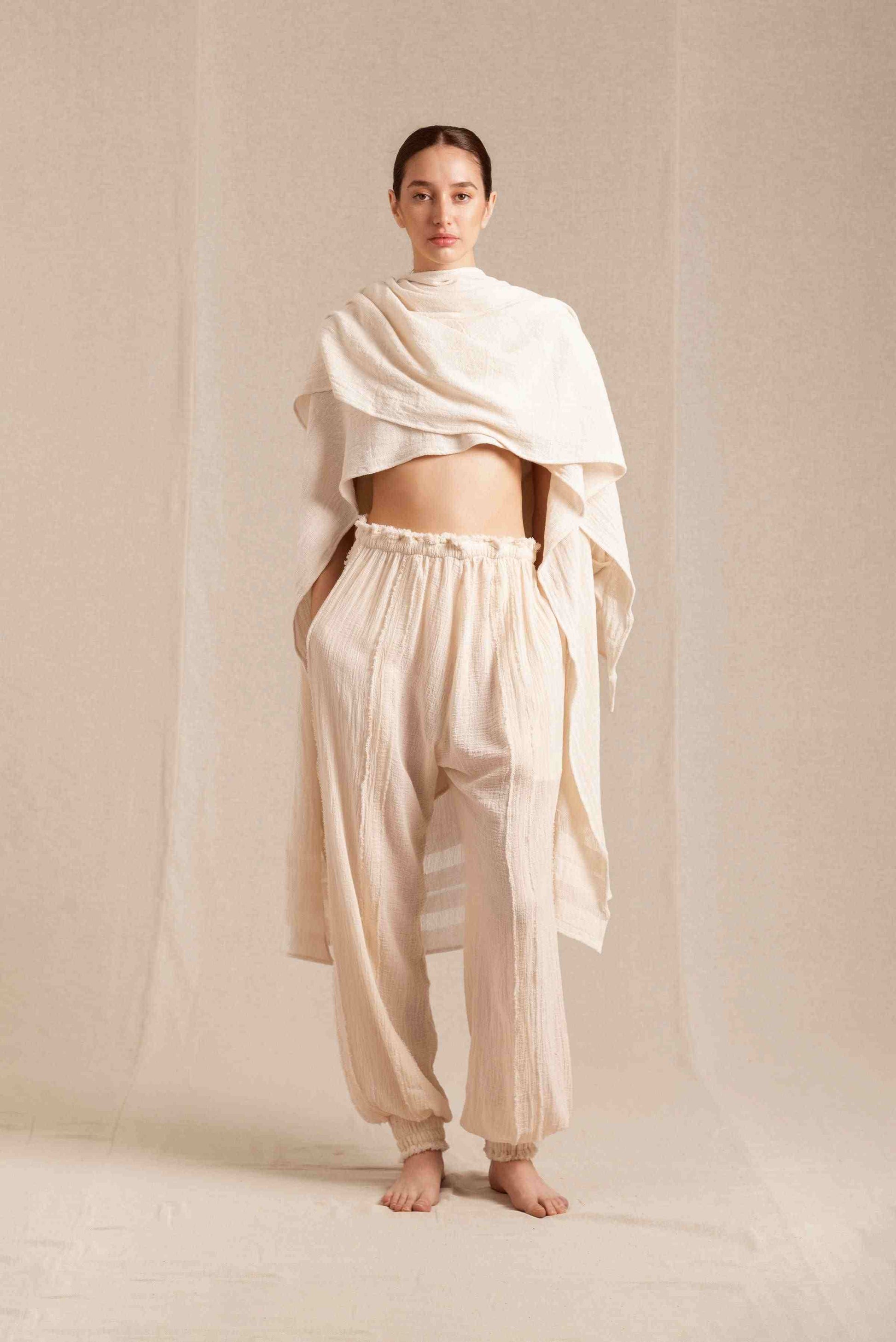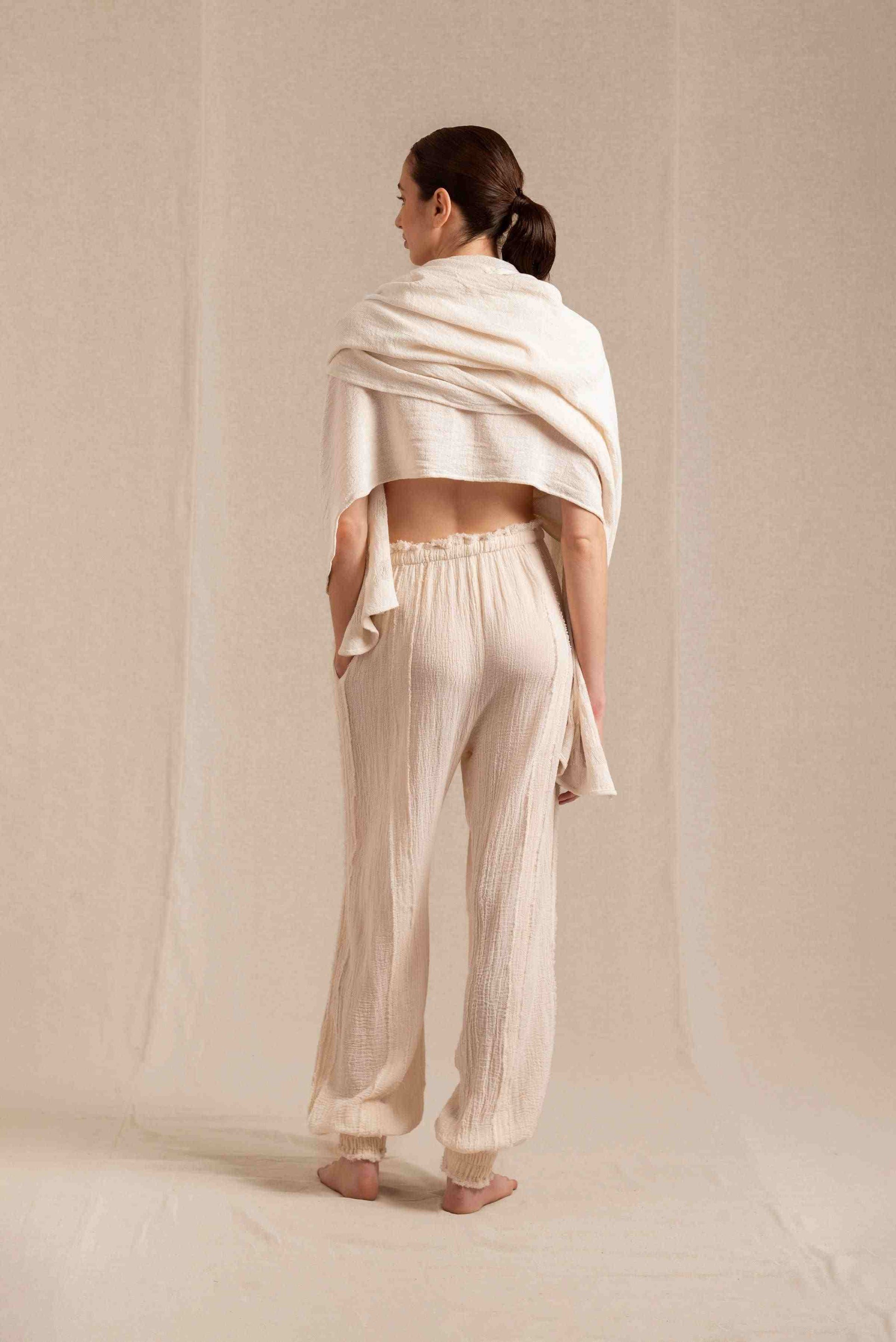 • Artisanal cotton fabric with elasticated waistband and ankles