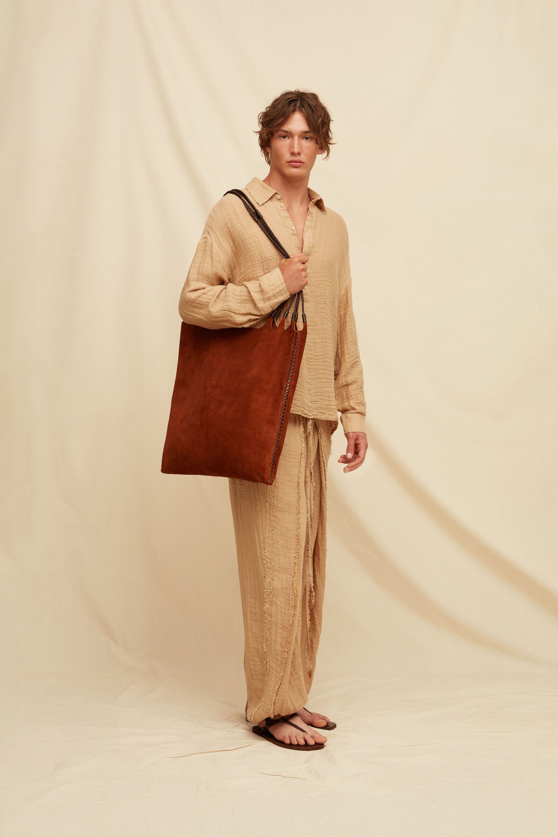Bold in scale yet soft in presence, this piece is crafted from raw, supple suede in a deep miel oscuro tone. Designed to move with the body, it drapes with a natural fluidity, shifting shape as you carry it. The distinctive seam stitching adds an unexpected detail - subtle yet striking, a quiet nod to the artisanal hand behind every piece. Spacious, grounded, and beautifully undone.
