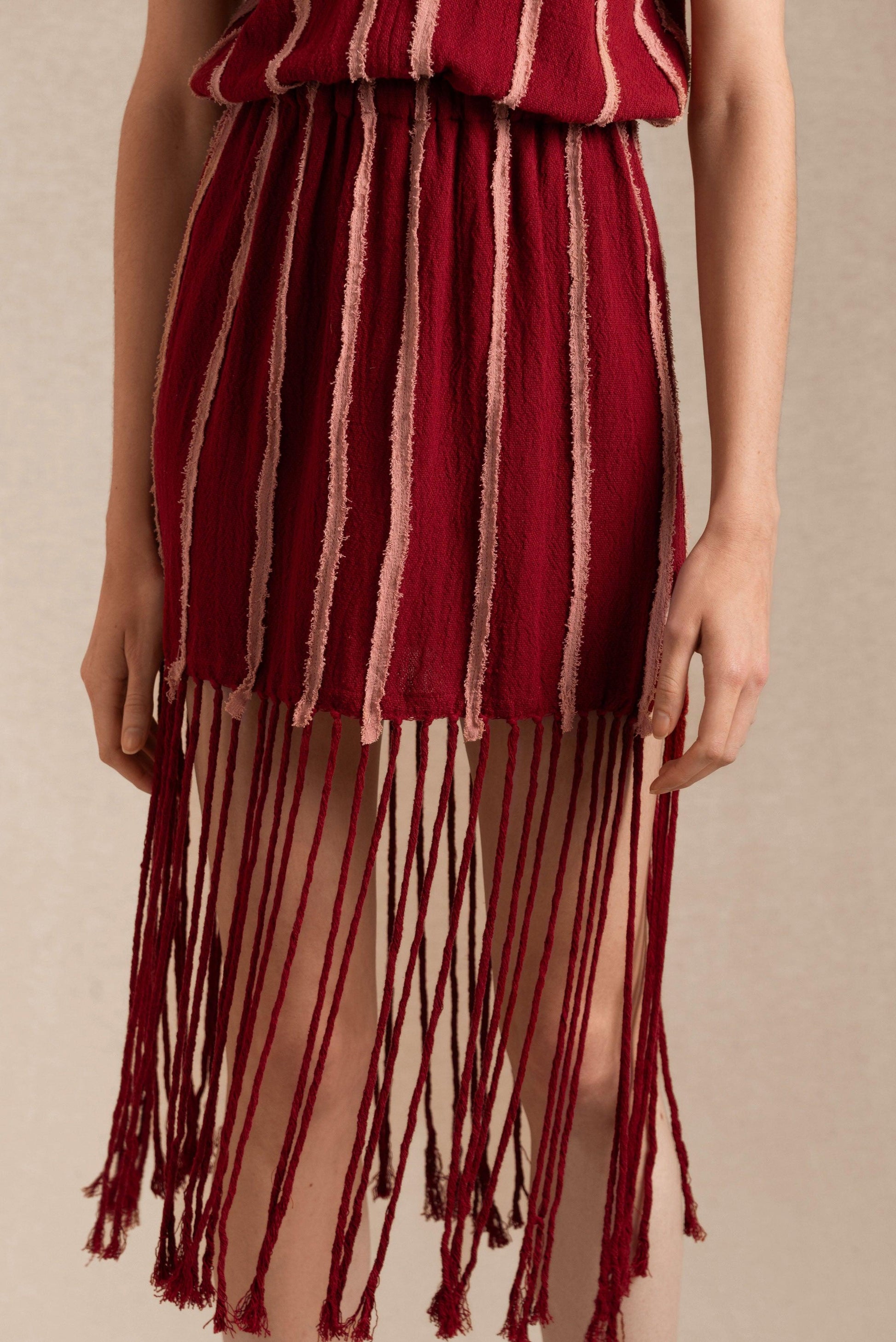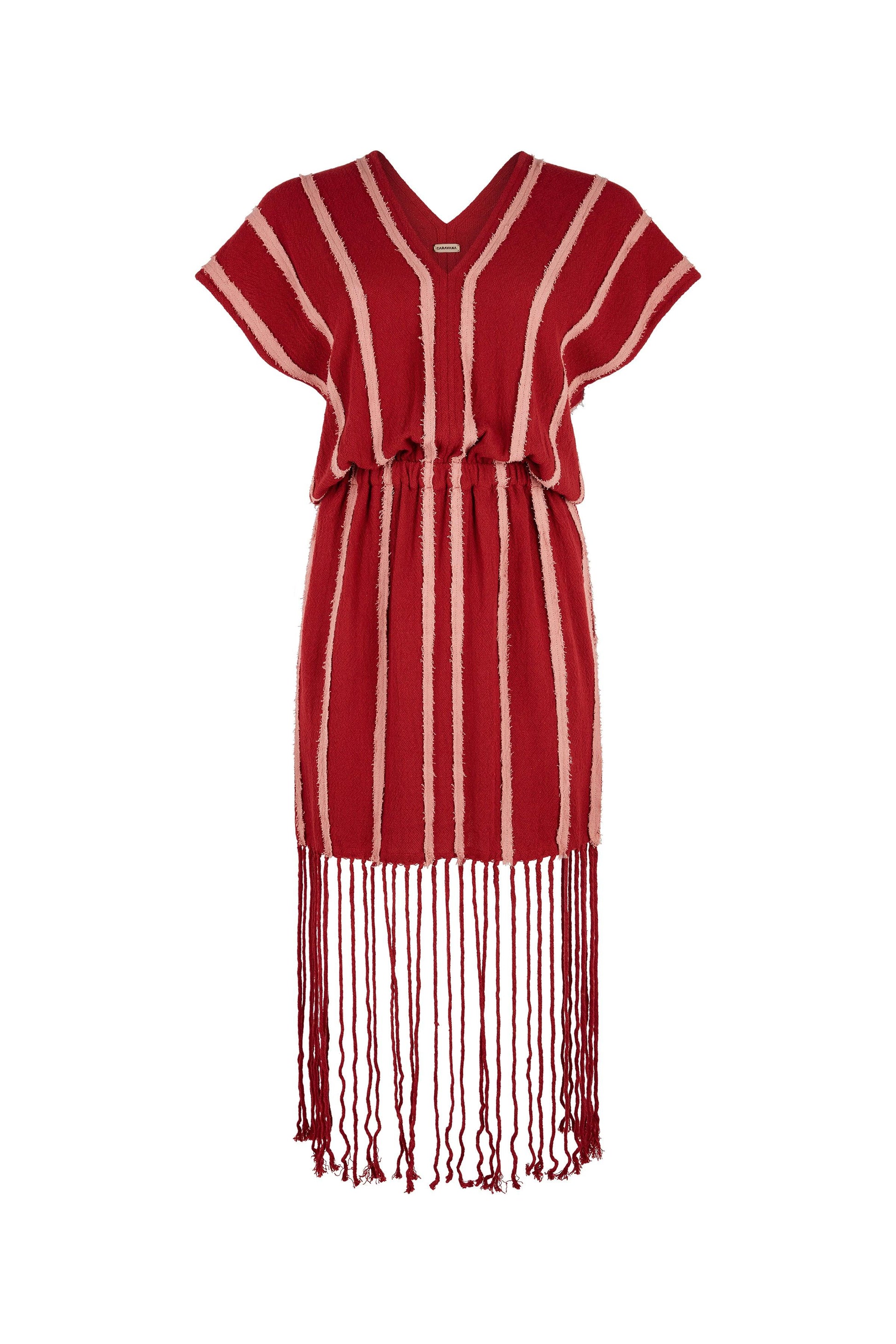 Captivate the room in this delightful piece, the TIKUI dress, with mesmerizing long fringe dancing along with your movements. This cotton jute and artisanal cotton dress lends you a vibrant look with its striking vertical line details, and an elasticated waistband lets you style this dress in different ways along your waist.