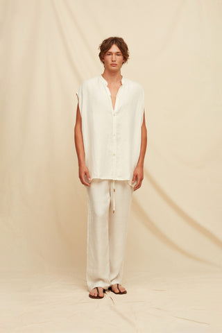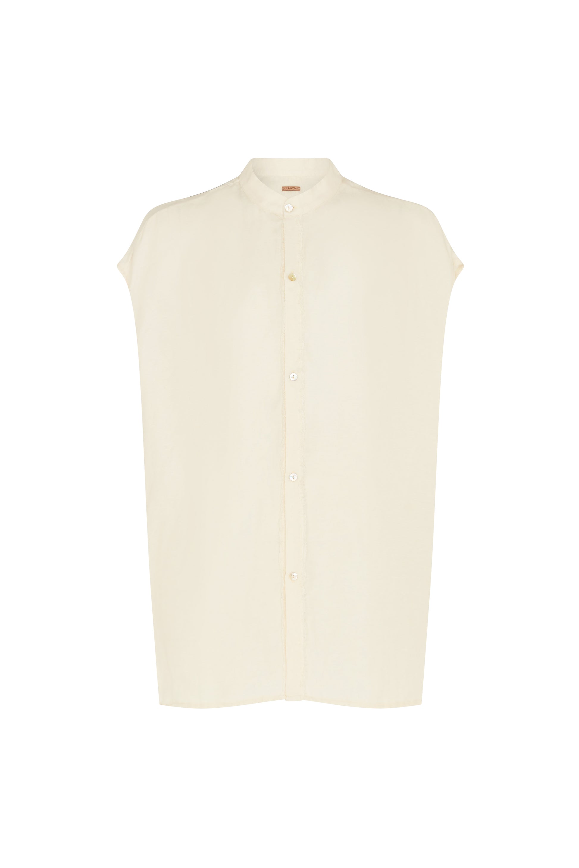 Sleeveless with quiet structure. The Tsaalmuy Shirt features a subtle stand collar, a clean button front, and a faint fringe at the hem. Light, minimal, and grounded in texture, it's a pared-back staple with a thoughtful edge, and just enough presence to catch the eye.