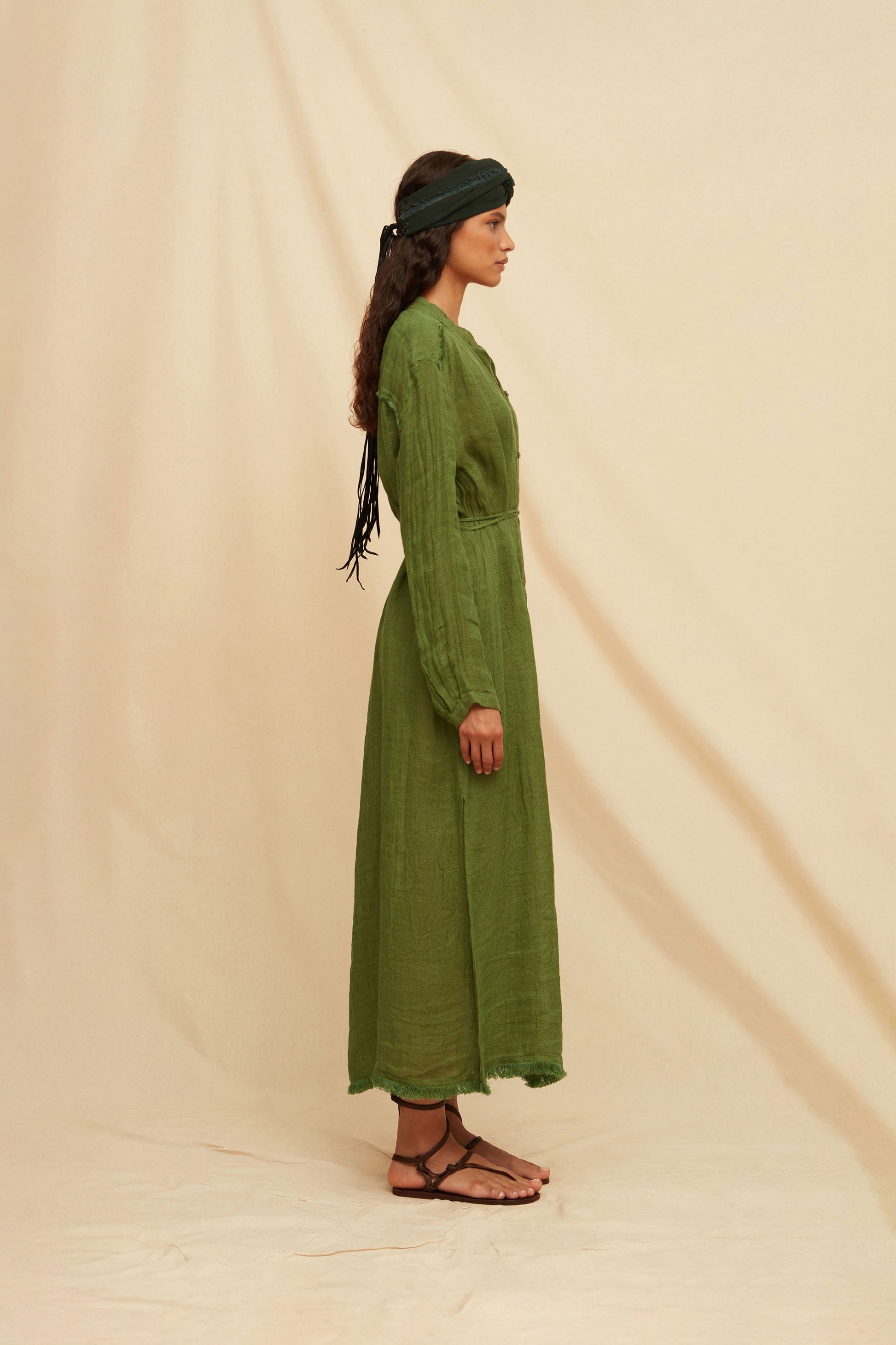 The Tsudi is cut long and easy, with a stand collar, side splits, and deep pockets for grounding. A wide waist tie with braided leather ends lets you shift the silhouette, or leave it loose. Feels modest, but never rigid. For when you want quiet impact with no compromise on comfort.