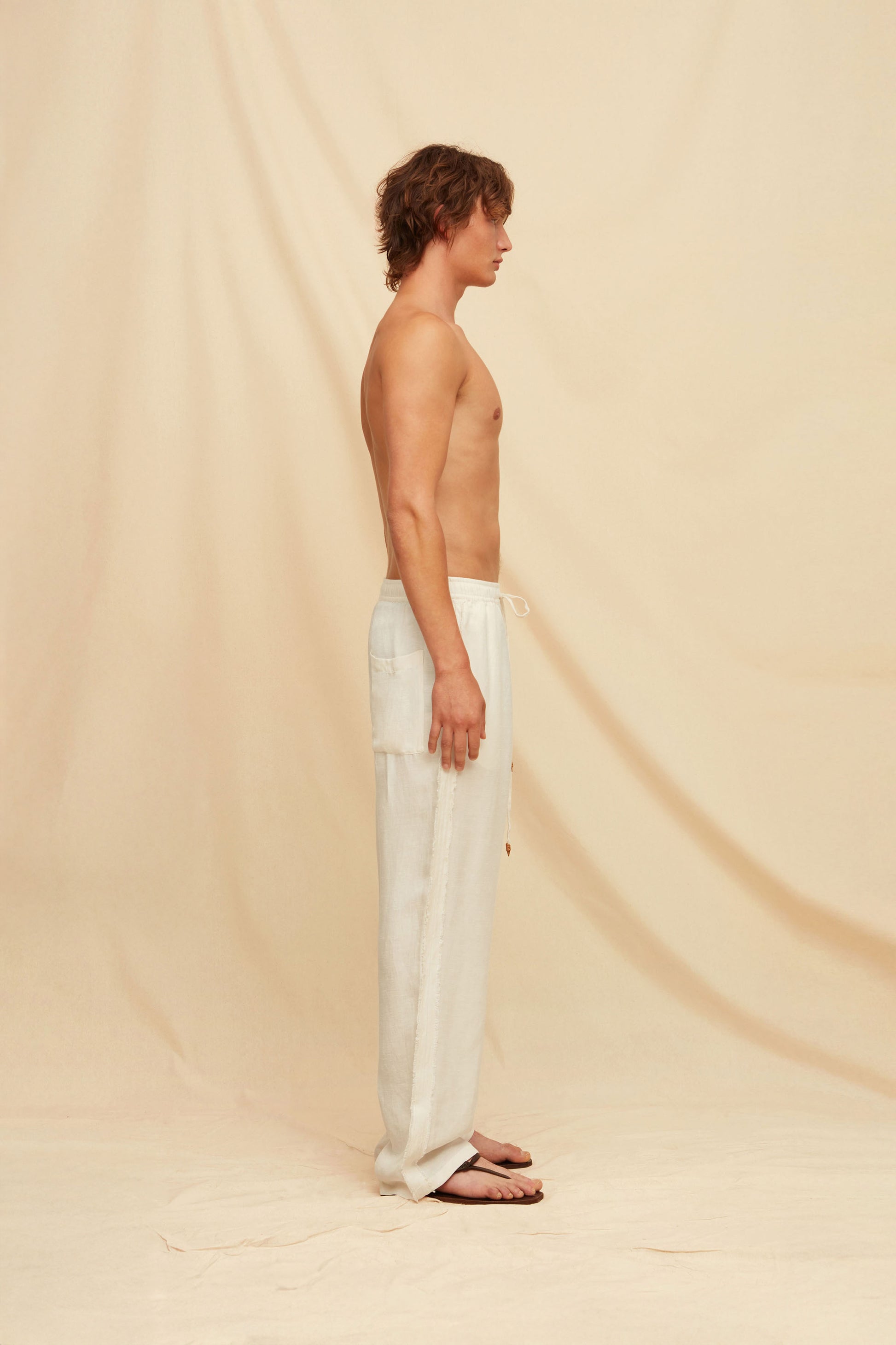A straight-leg trouser with lightness in its step. The Tujuun Pants fall easily from the waist, with side seams that trace the body and pockets at hip and back. In soft bone white, they're loose, simple, and designed to be lived in, wherever you go.