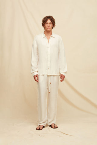 Sharp in shape, soft in mood. The Ukul is a classic shirt with a full button front, pointed collar, and subtle fringing along the shoulder seam. It wears well clean or crumpled, the kind of piece that makes everything else look easy.