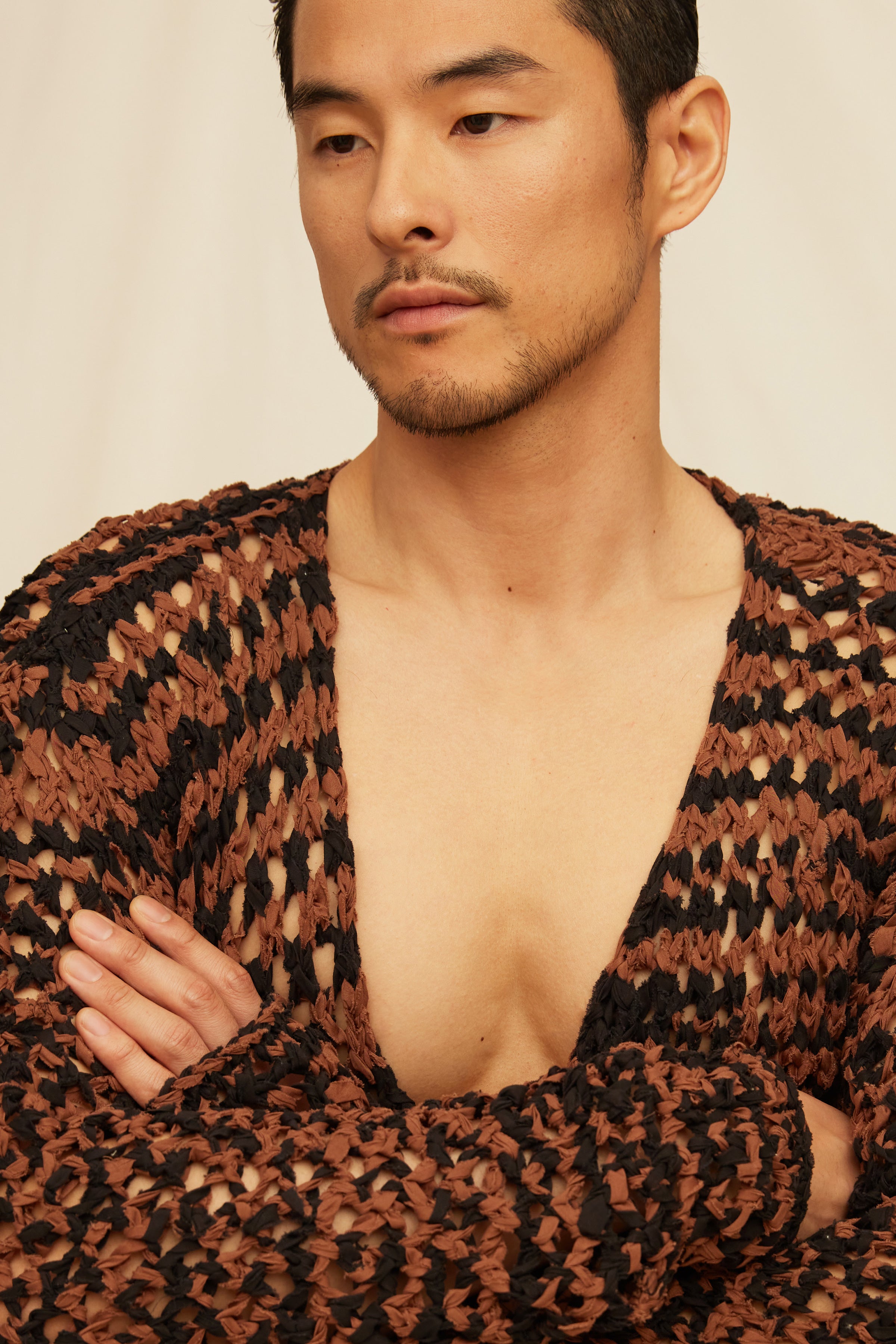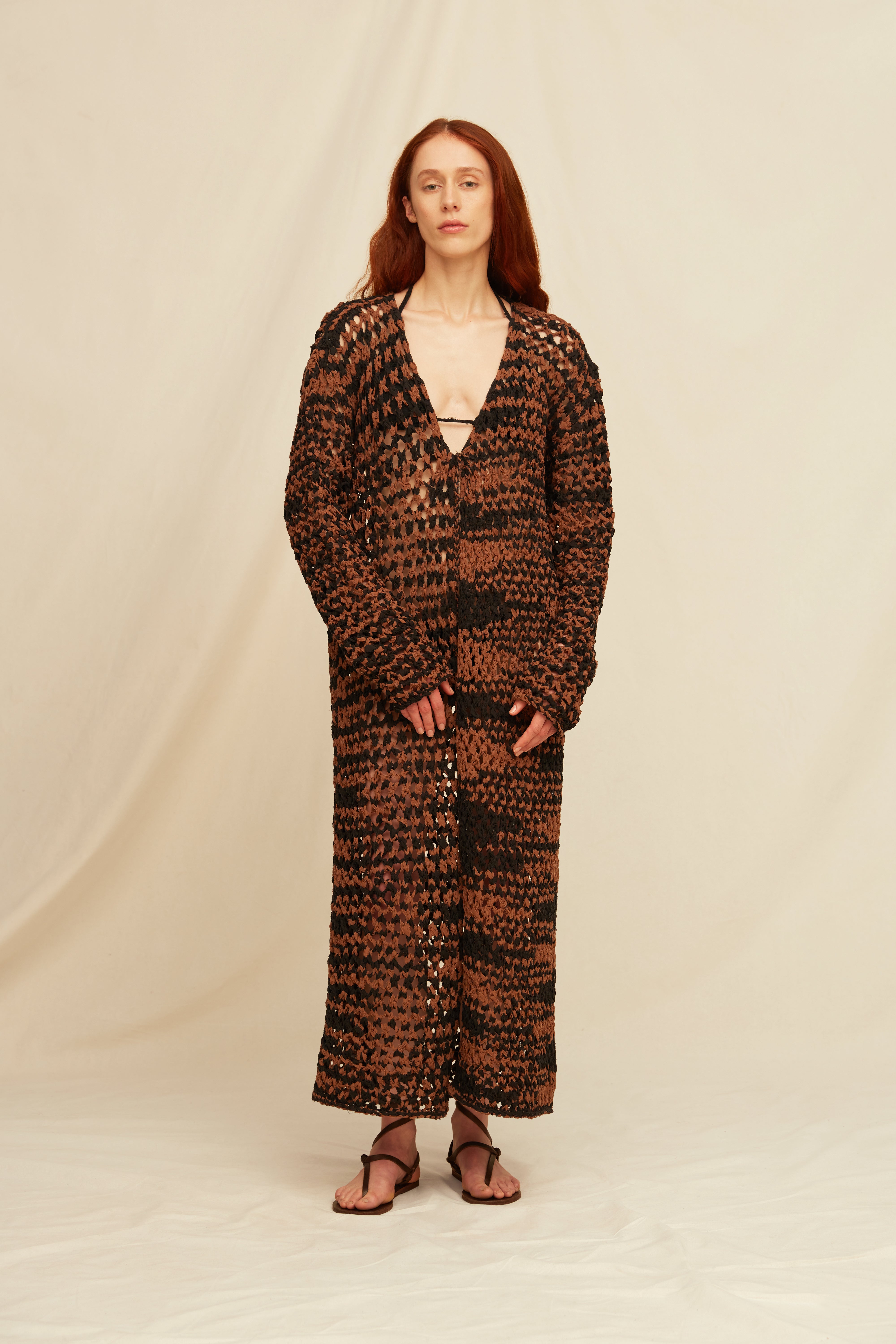 Some pieces don't repeat themselves. This open cardigan - hand-knitted in freeform macrame - is one of them. Every line, every tie, every hand-beaded tassel is unique. Wear it over nothing, wear it over everything. Just don’t wear it like anyone else.