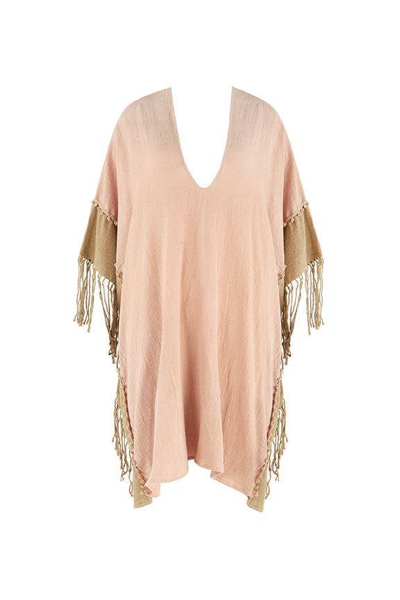 The WISA dress captures the essence of duality in a distinctive bi-color dress. Knot details and cascading long fringe along the hem weave a tapestry of expression.