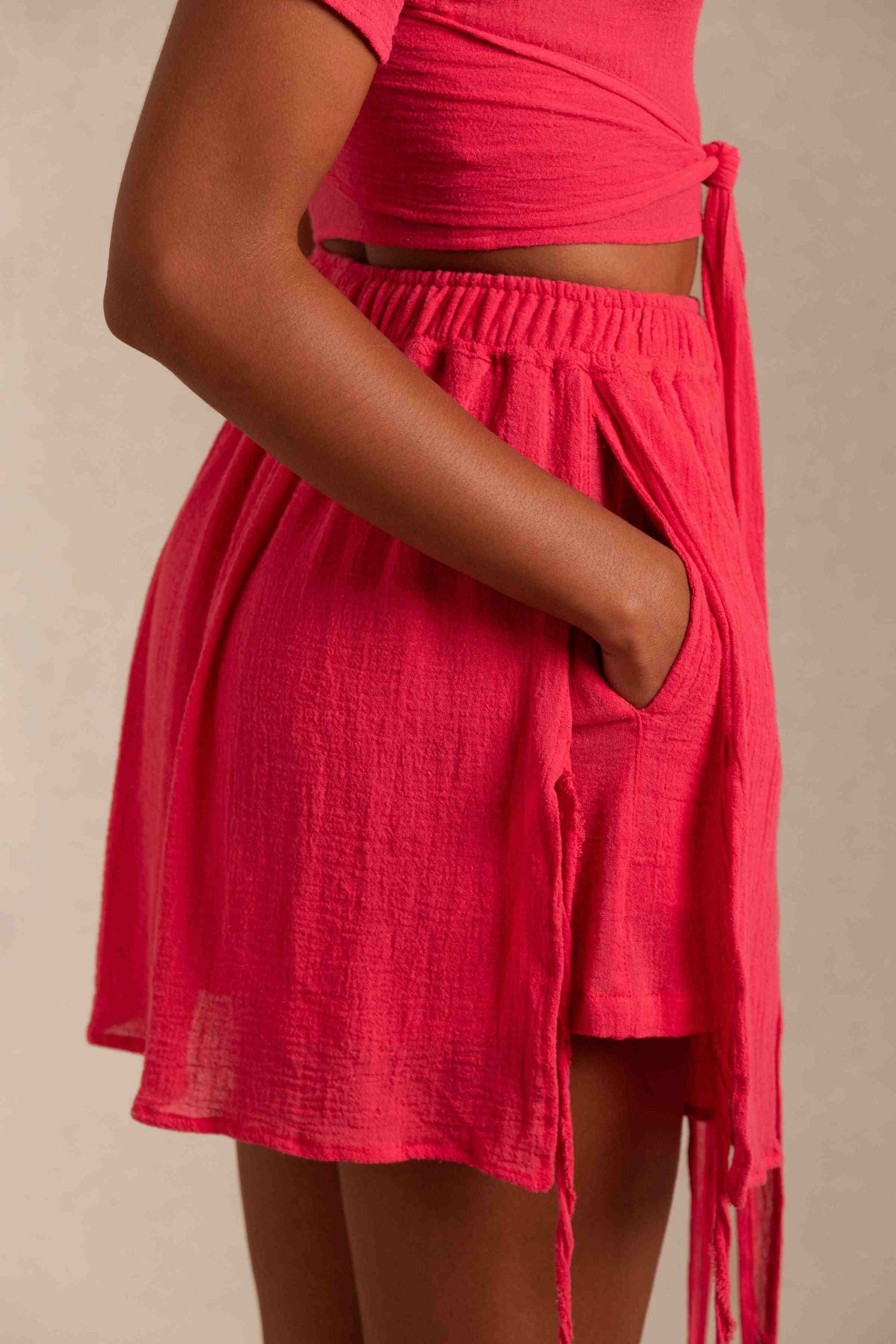 The XINI shorts are a playful illusion; at first glance, you see them as a skirt, but underneath the elegant front panel are shorts, promising protection and grace as you enjoy your days in this piece. Long ties trail down the sides as a decorative element, moving along with you.