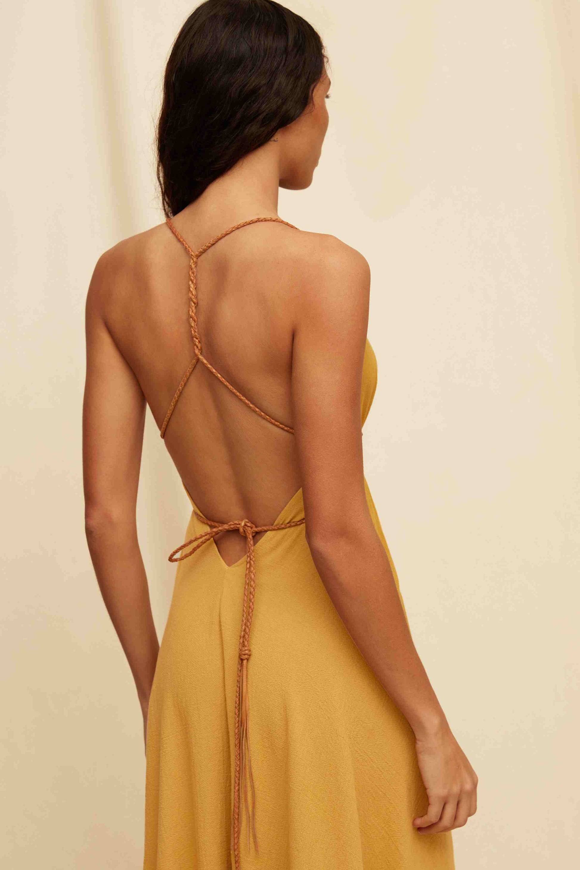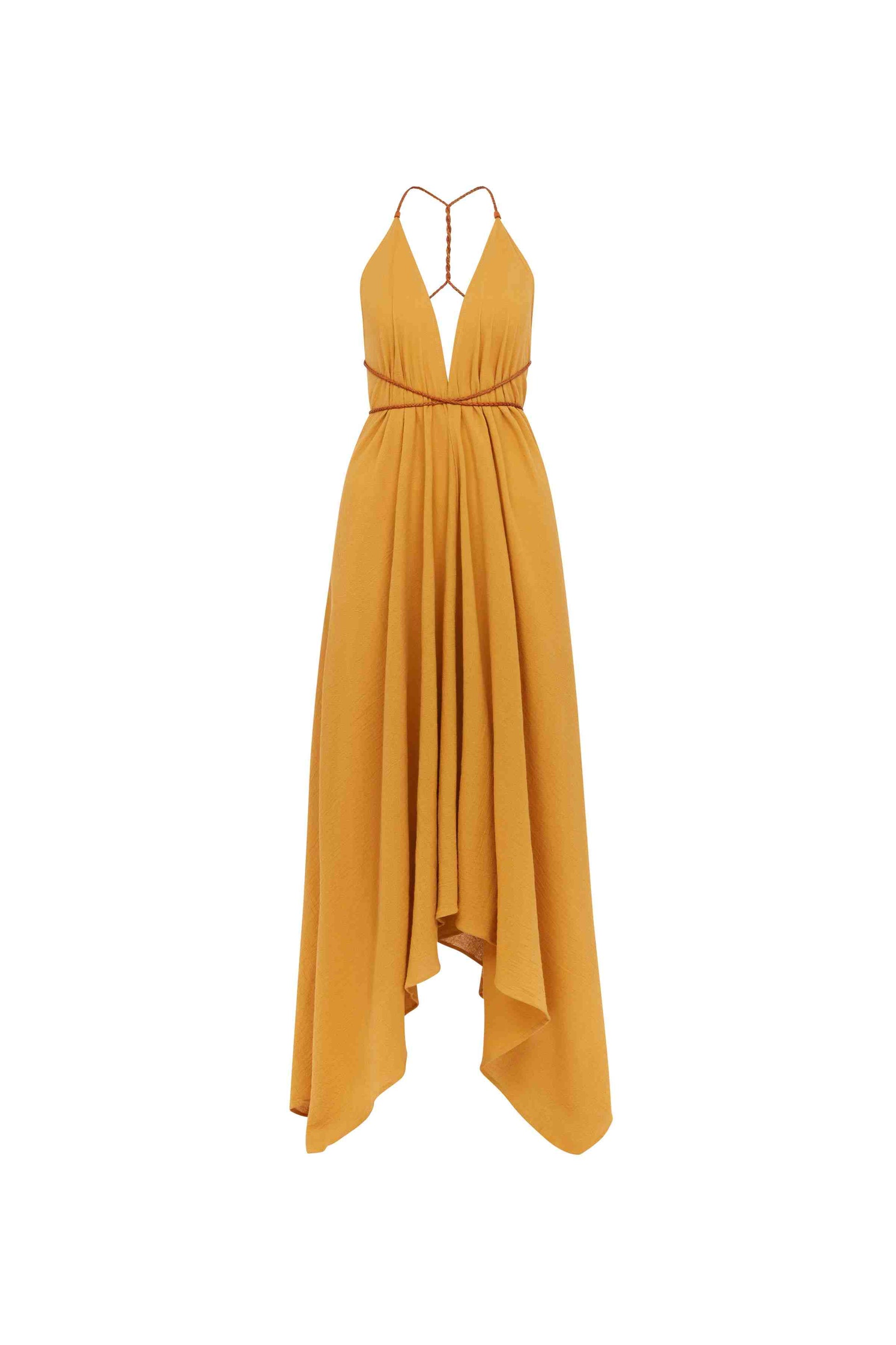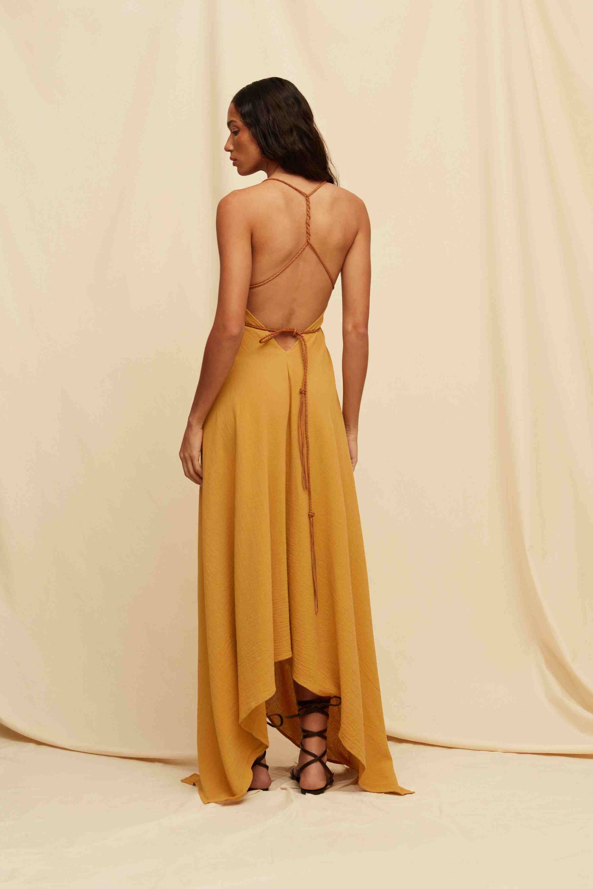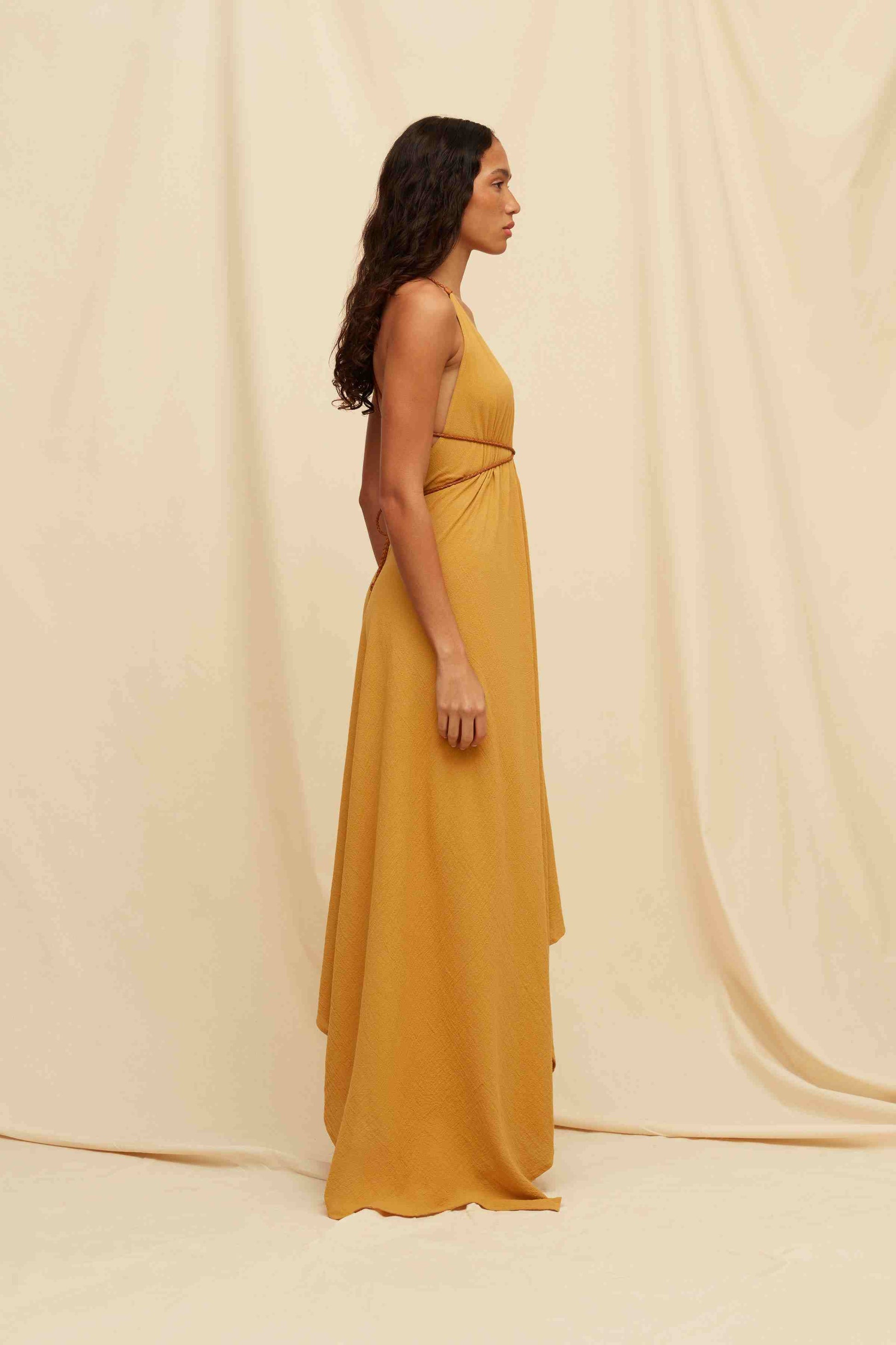 A luminous take on earthy minimalism, the YATZIL dress flows in soft artisanal cotton, enhanced by mini frayed edges. The warm mustard hue adds richness to its understated silhouette, creating a balance of comfort and refinement.